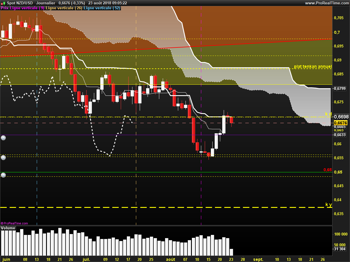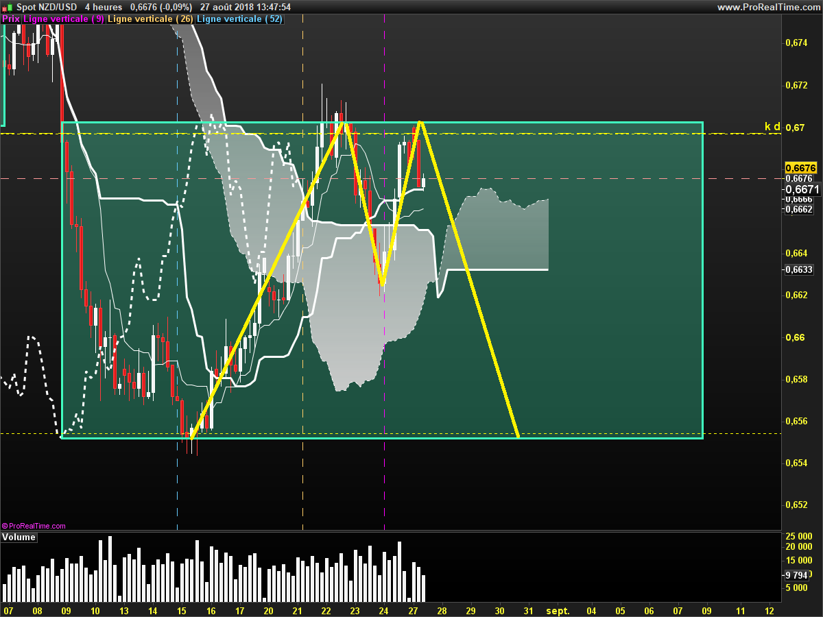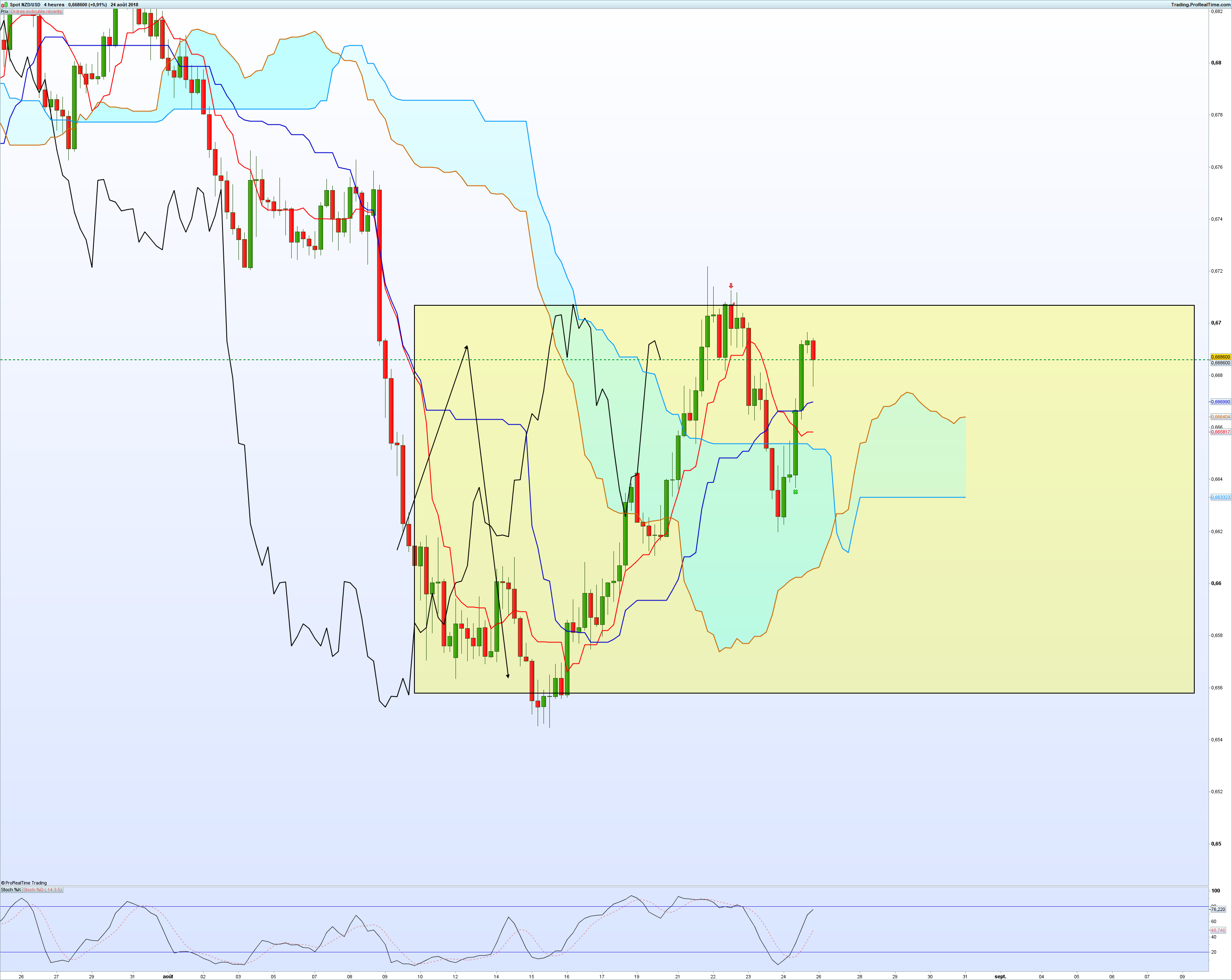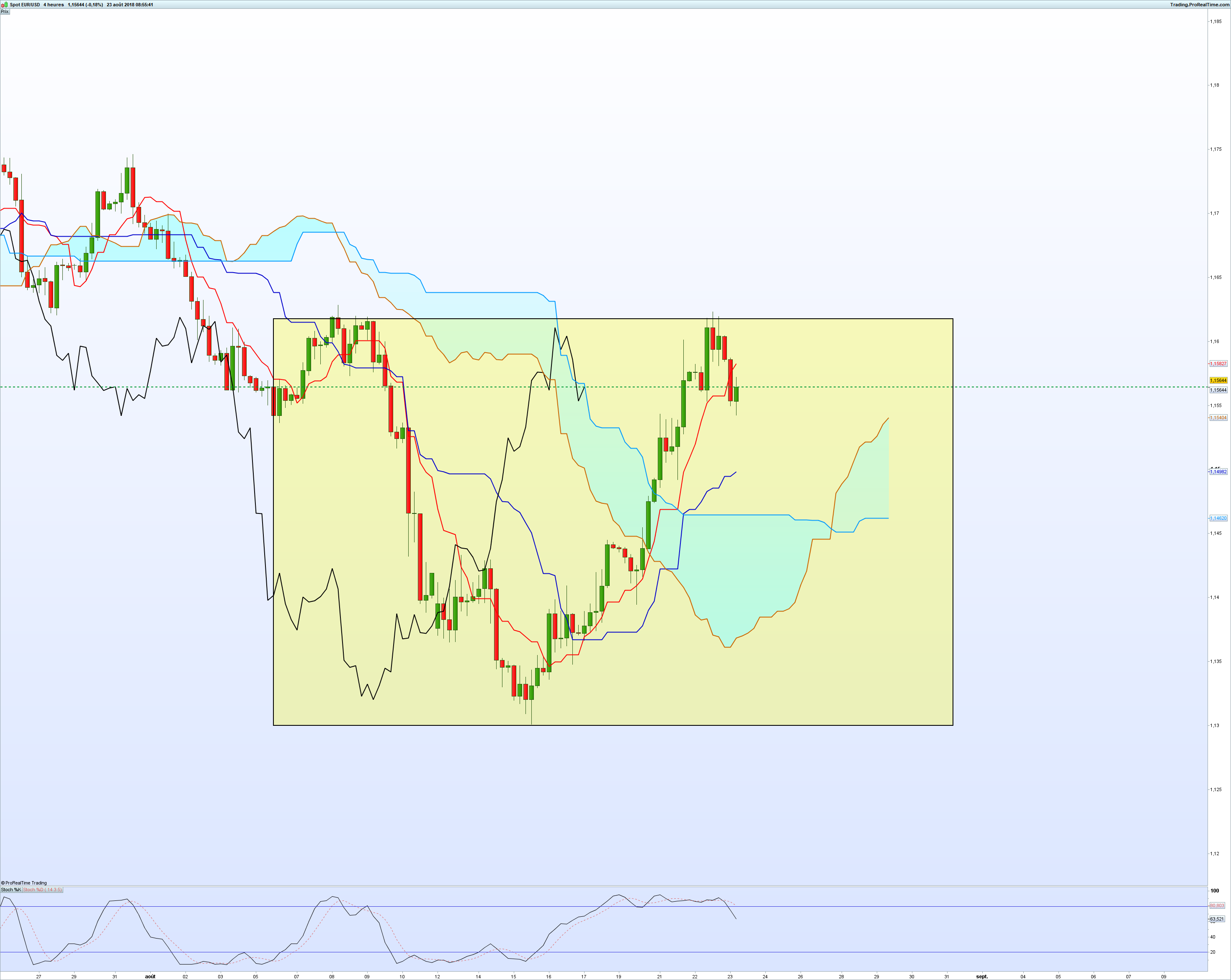 En H4 la fameuse zone d'équilibre a stoppé les prix (la zone d'équilibre quand on vend en haut de range ou quand on achète en bas est la première cible comme expliqué dans ma formation totale à l'ichimoku ou dans cet article par exemple https://www.centralcharts.com/fr/6763-aud-usd/analysis/41611-aud-usd-4h