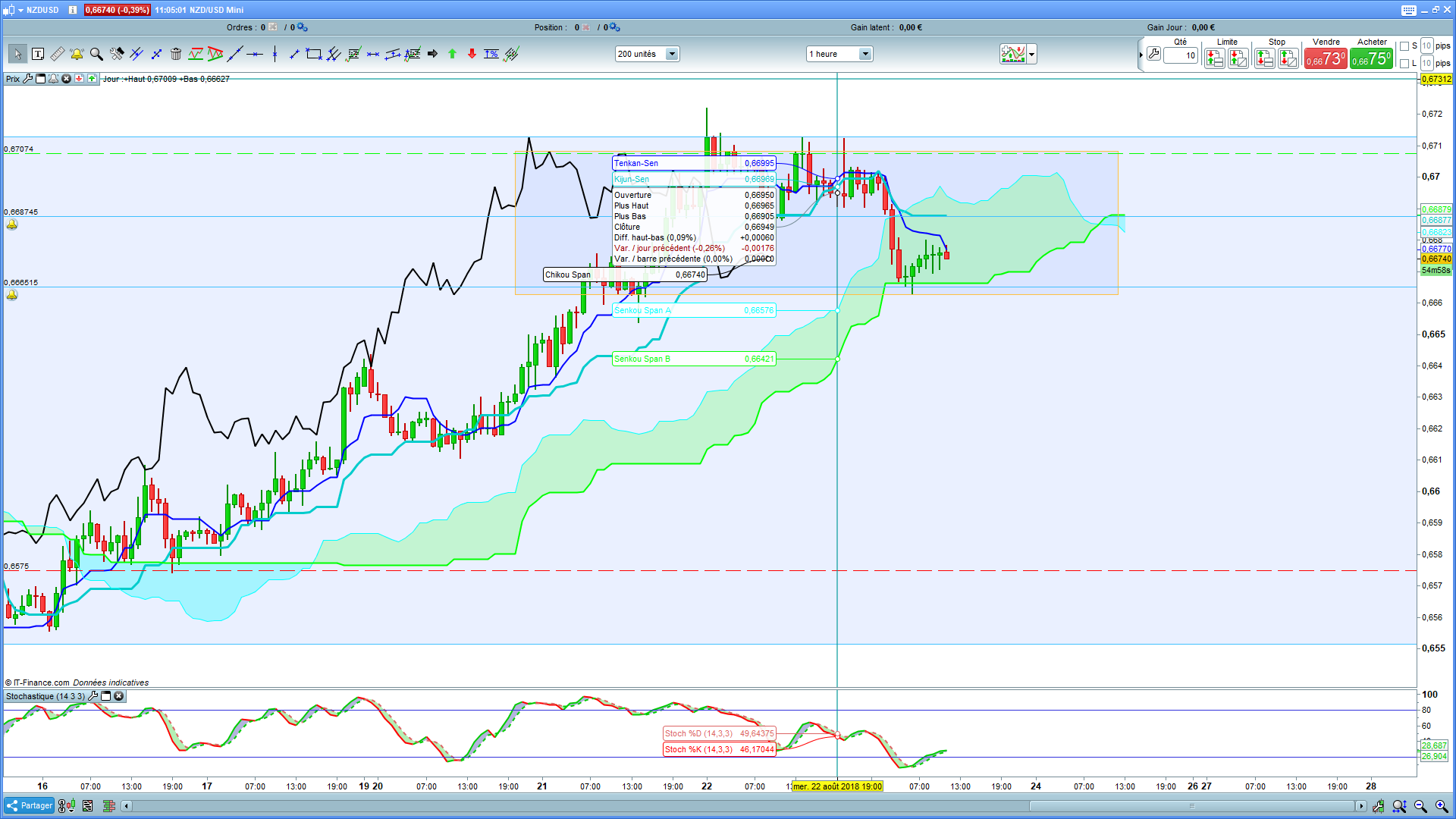 Je ne suis pourtant pas sorti et n'ai pas encaissé de bénéfices parce que en H1 la kijun sen (proche de la zone d'équilibre du H4) semble faire résistance. Tant qu'elle n'est pas cassée à la hausse, je reste en position. Je vais d'ailleurs placer mon stop loss au dessus