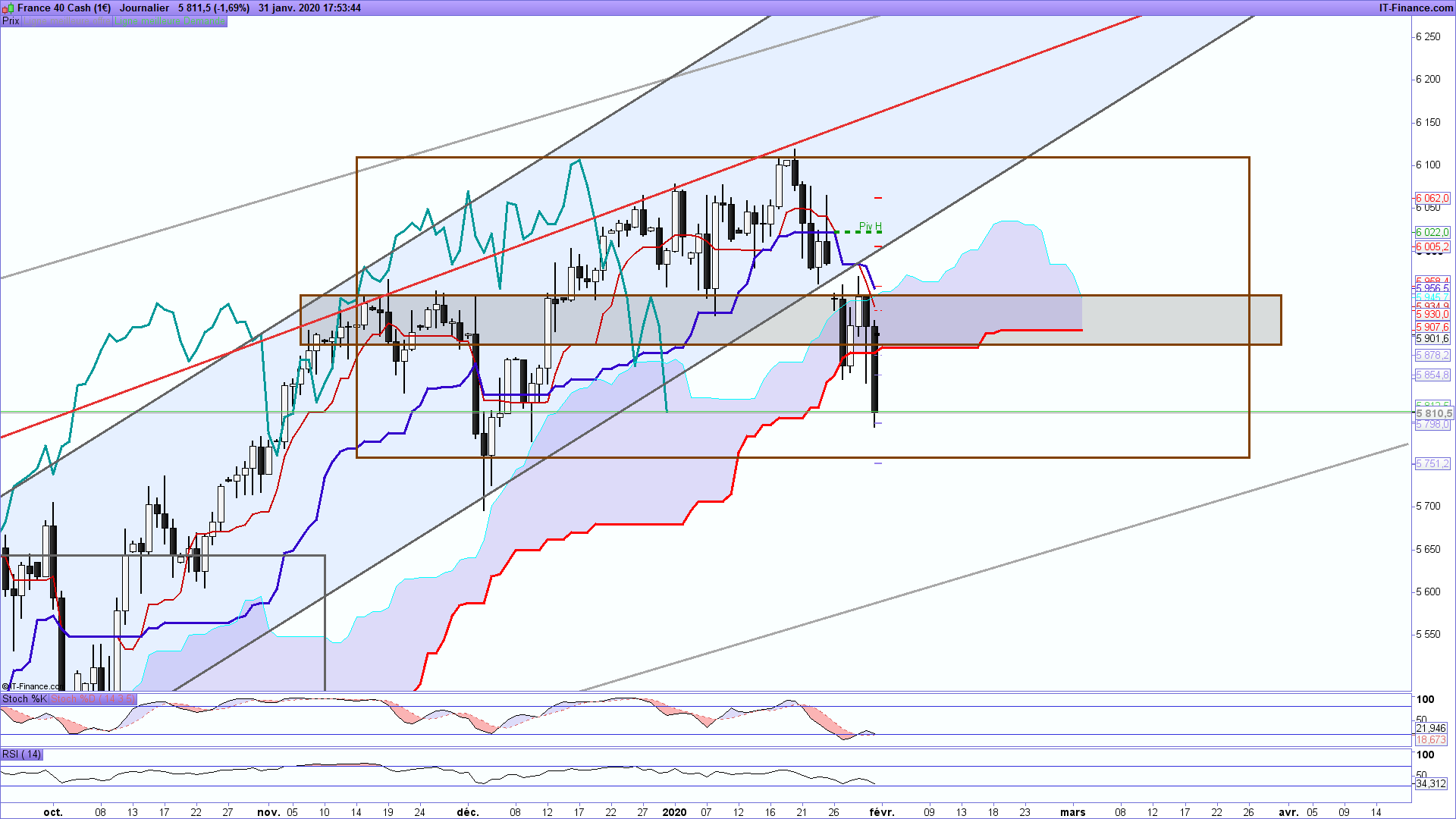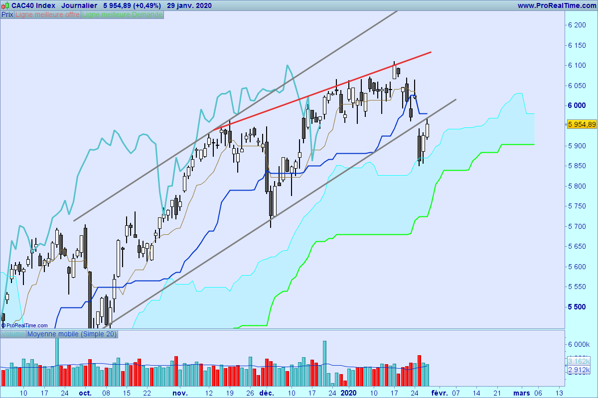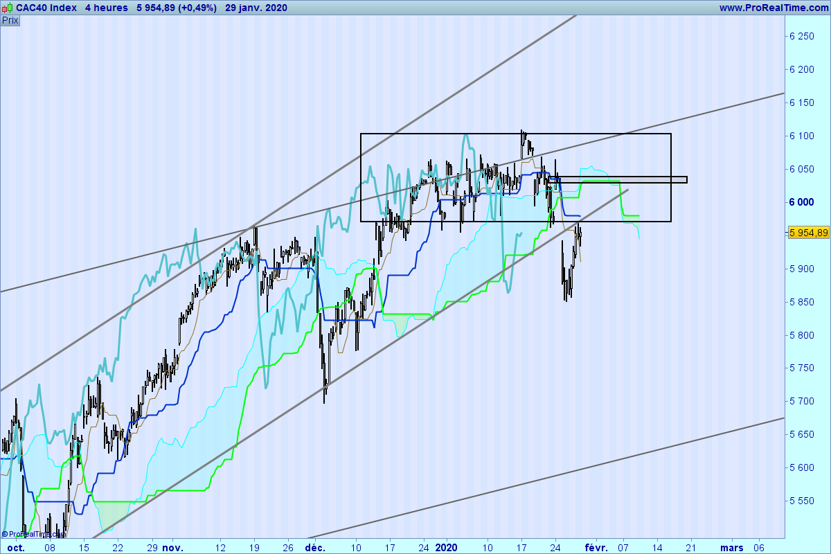 Bonjour pierdi, n'oublie pas que la chikou est un filtre et tu peux voir qu'elle a été repoussée par sa kijun. Toutefois, tu as raison, il est difficile d'anticiper quoi que ce soit: reprise haussière alors qu'on bat les plus hauts historiques, ou baisse d'un indice qui ne veut que monter? Impossible à dire. Ce qui est vrai, c'est que le virus chinois impacte fortement l'économie du luxe dont les plus grandes entreprises du CAC40 sont les leaders. Le repli est donc logique d'un point de vue fondamental (pour une fois que la technique et le fondamental se rejoignent....).
