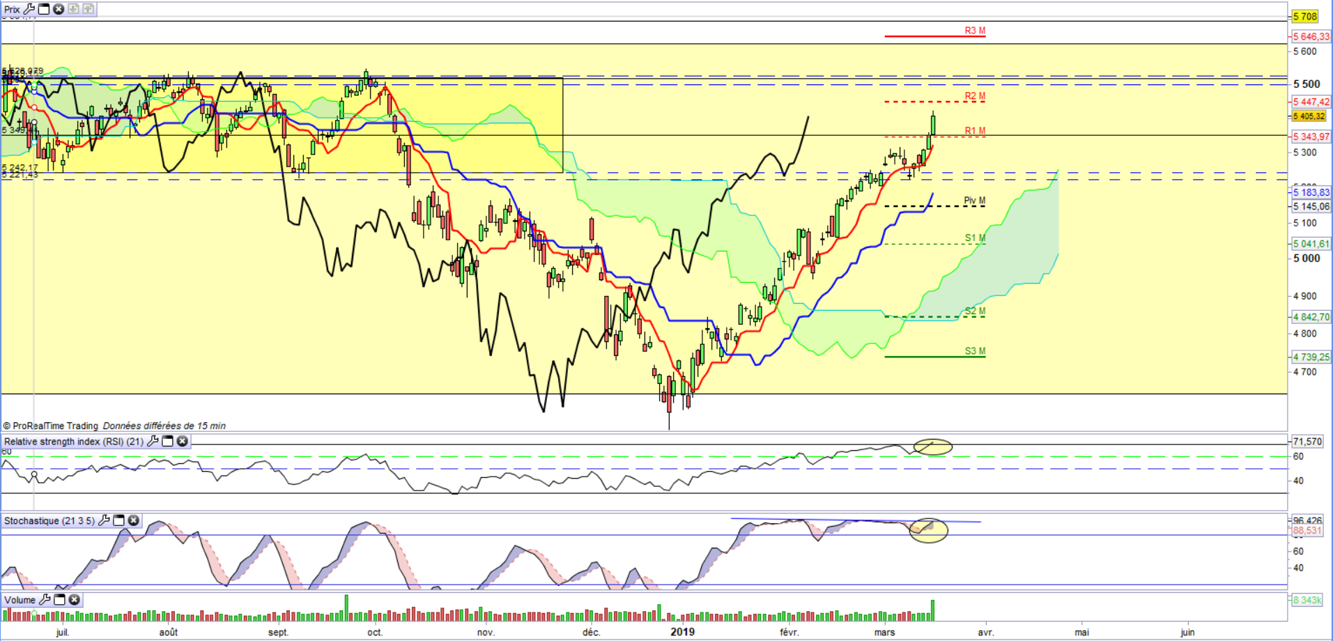 3) On l'a dit sur le weekly, nous arrivons sur la zone psychologique des 5500 pts. Avant ça, la R2 mensuelle pourrait faire barrage.