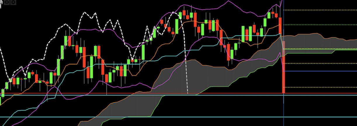Les prix ont cassé leur range m5 et sont partis à la baisse, puis pullback jusqu'à l'ancienne borne basse de ce range. je vois un doji se former sous ce niveau. Je pense donc à un throwback. je ne vise que la kijun m5 qui est le premier support direct des prix car grosse incertitude sur le H1: mieux veut encaisser peu que rater beaucoup d'un rien.