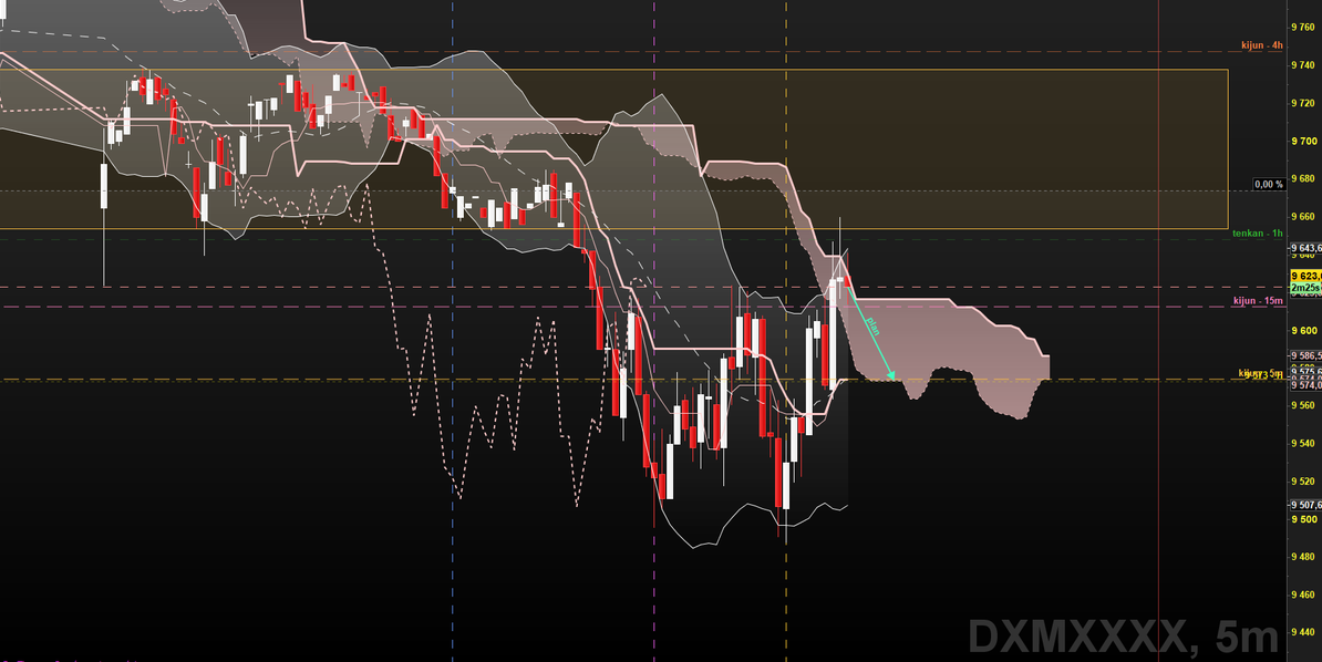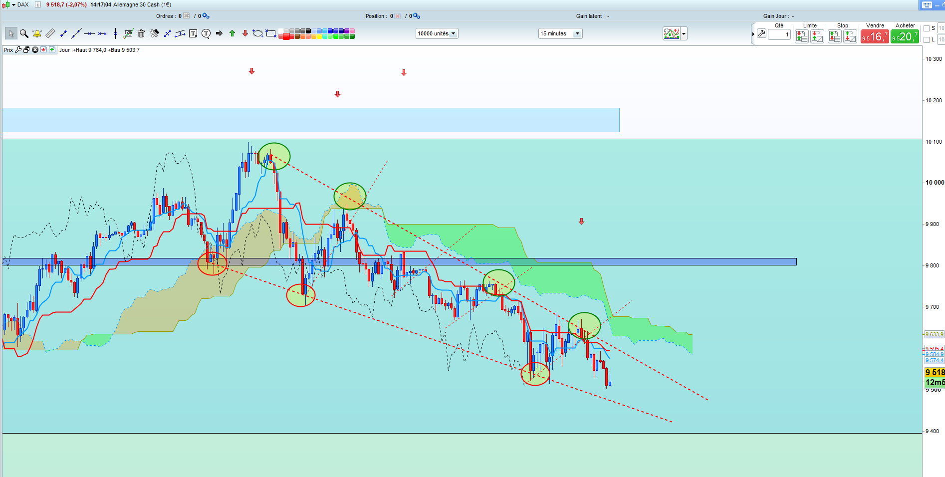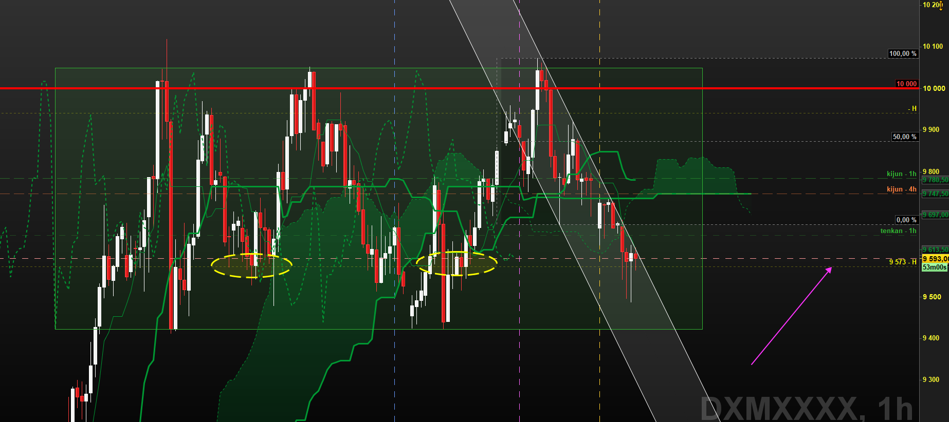 En H1, les prix semblent se diriger vers le bas du range, mais on a assisté à 2 marteaux consécutifs sur le support hebdo de juin 2016 à 9573. Les pris étant en survente, je n'exclue pas la possibilité d'un pullback sous kijun ou ZE avant retour baissier (ma vision est aussi baissière en H4 et en daily avec un retour sur la zone 9150)