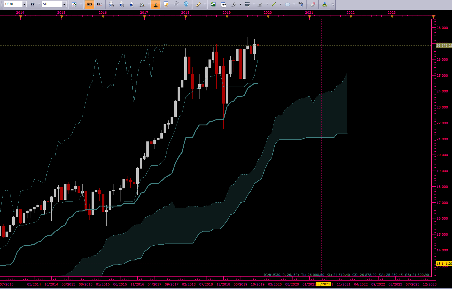 En mensuel, la tendance est haussière. On a même atteint un plus haut historique en juillet. Depuis, plus de hausse mais pas de baisse non plus. On voit la kijun éloignée et elle va rester ainsi très longtemps, peut-être plus d'un an car la mèche basse de décembre 2018 entre dans son calcul. Un retour sur cette kijun n'est donc pas à exclure bien que la tenkan accompagne parfaitement le mouvement.