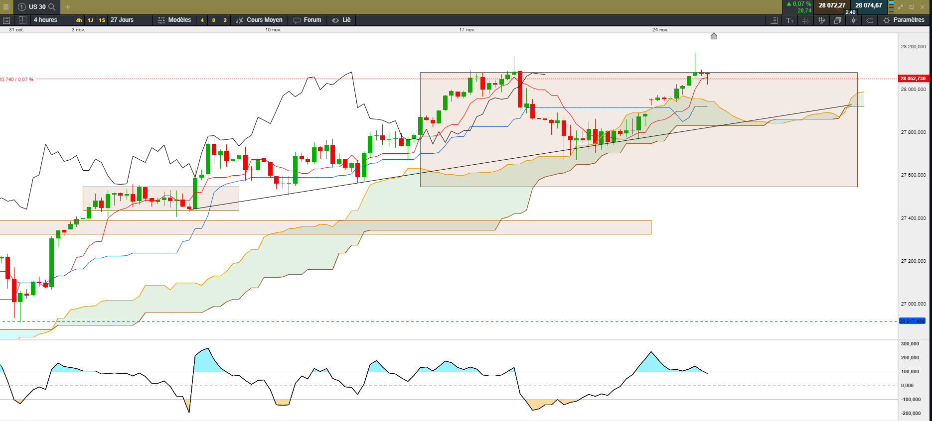H4: difficile de tracer le haut du range, en revanche, on note une résistance oblique baissière en clôture de bougie dont c'est le quatrième contact. le surachat observé également peut laisser envisager un throwback.