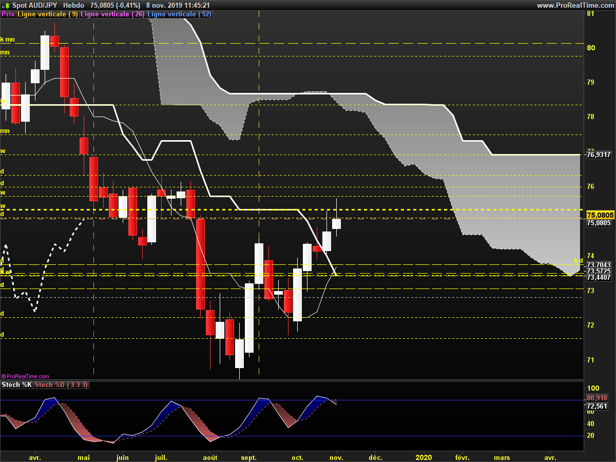 hebdo: les prix semblent repoussés par le niveau de kijun plate (pointillés épais), chikou est venu au contact des prix qui font résistance