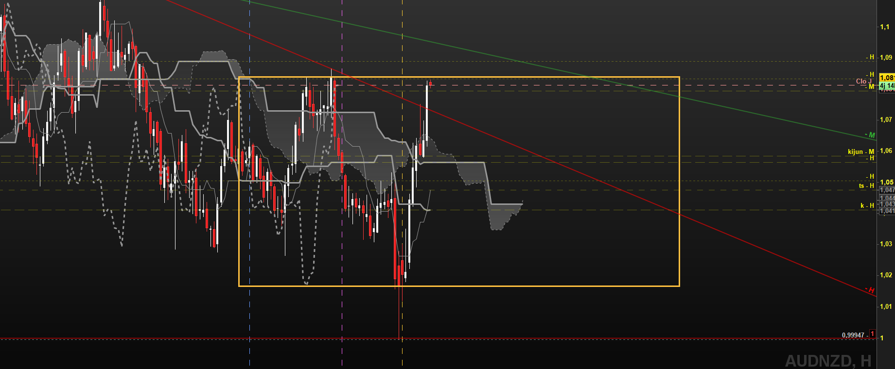 H1Plan de trading:Haussier:Attendre la cassure de la borne haute du range H4 = oblique hebdo.