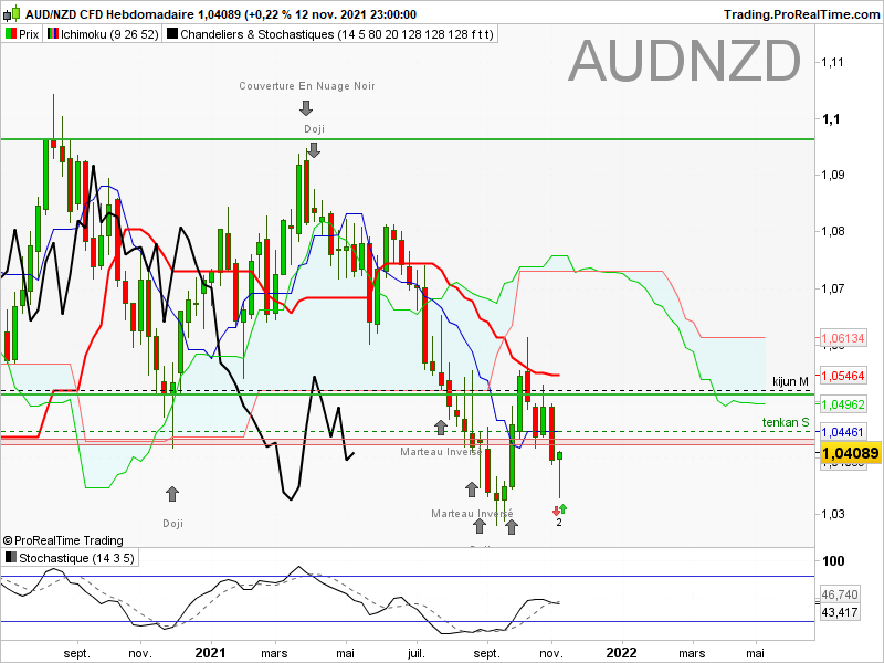 Tendance haussière. Les prix ont travaillé autour de la Tenkan correspondant à un ancien plus haut, mais elle joue de nouveau son rôle de support et donc la hausse semble en route.