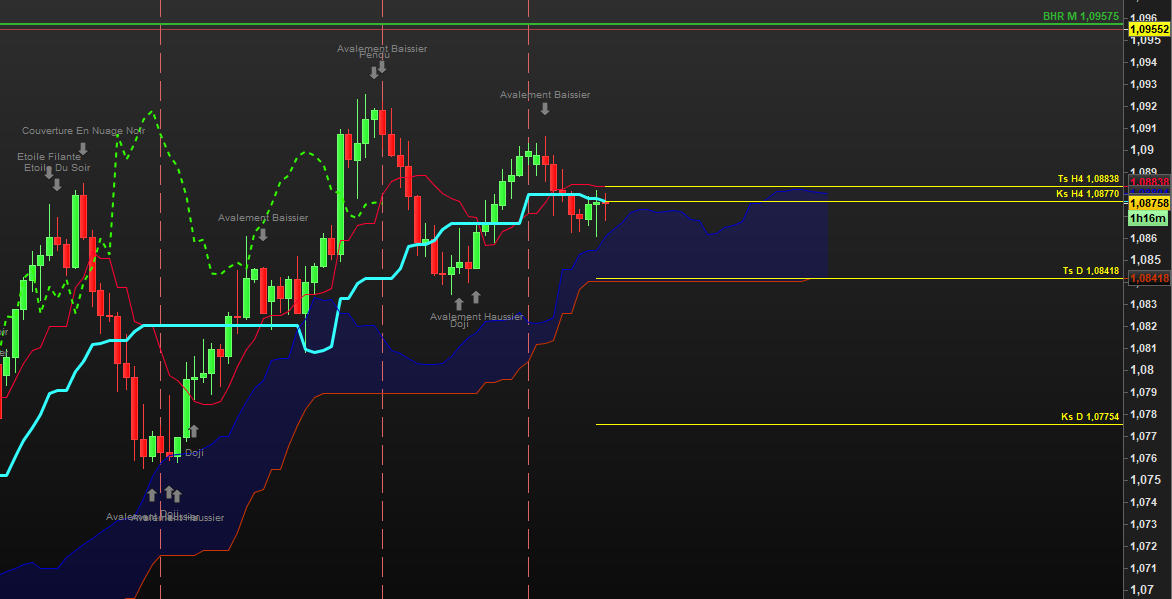 Si sortie par le bas, très probable d'aller chercher les plats SSB H1 puis Kijun Daily avant de reprendre une phase haussière direction le haut du range mensuel