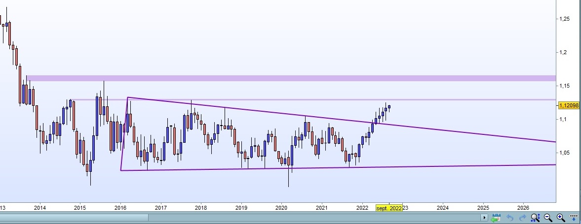 Triangle descendant, qui, une fois n'est pas coutume, a cassé à la hausse. On arrive sur une zone de prix mensuelle pas loin : clairement on va y aller. Au niveau des bougies, beaucoup de petits dojis : la hausse n'est pas fulgurante, néanmoins elle reste solide.