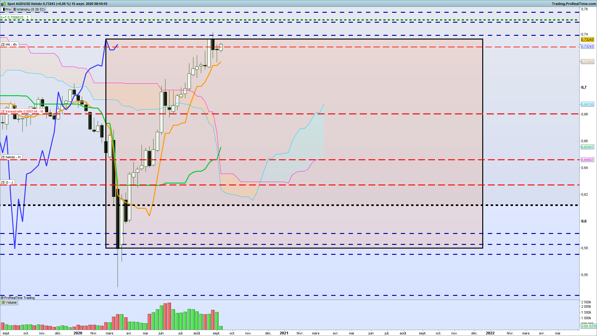 - Nous sommes dans le haut d'un range supposé en hebdo avec 1 tenkan Trimestrielle et 4 kijun mensuelles qui bloquent les prix en résistance, en support nous avons la ZE trimestrielle, j'aurais donc tendance à penser que les prix vont aller entre ses limites avant de casser soit par le bas soit par le haut.
