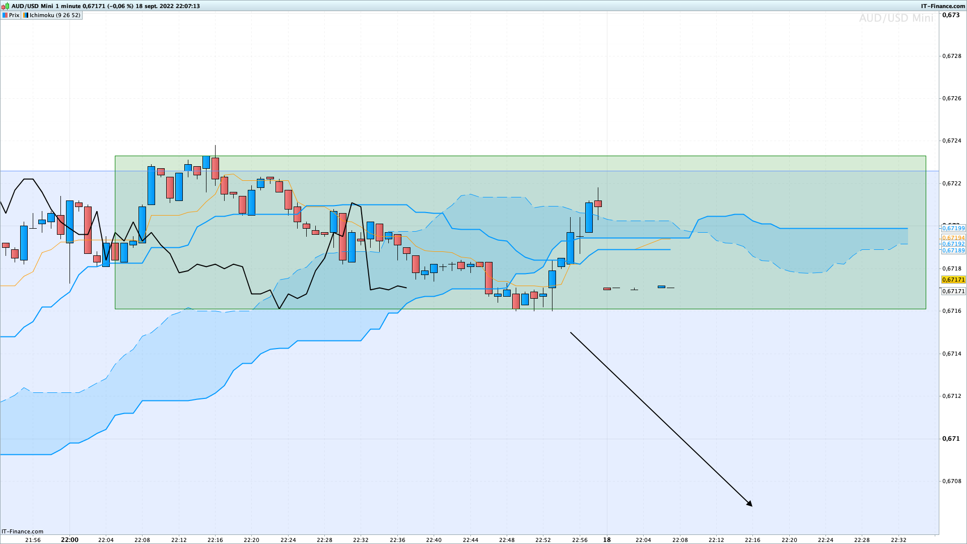 Plan : Sur cassure de la BB du range M1, nous pourrons envisager la ZE du range initial sur M15 (qui est également la kijun H1) // ratio supérieur à 1:2 avec stop placé au dessus de la kijun M1.