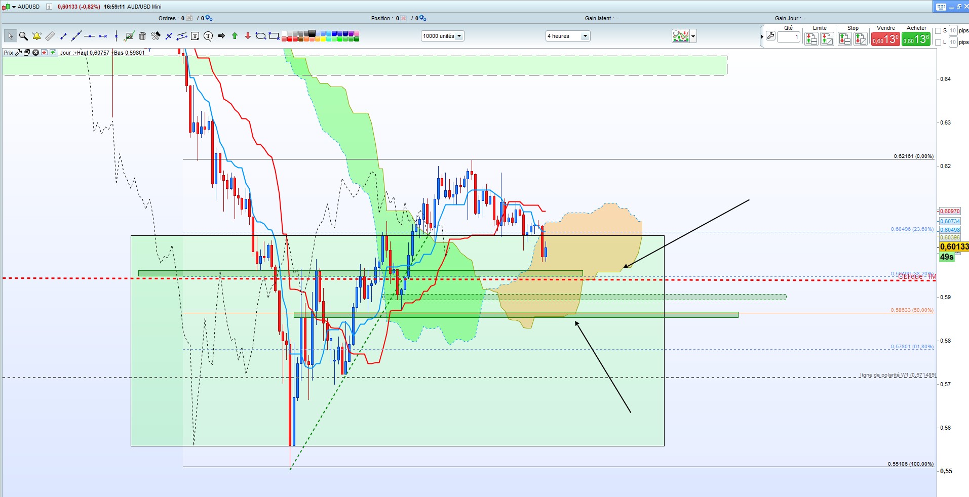 On observe bien que les zones tracés à l'aides des fibo seuls sont bien des lignes Ichimoku puisque ce sont des plats SSb pour le support du dessus, et plats SSb + kijun pour le support -50% fibo-.