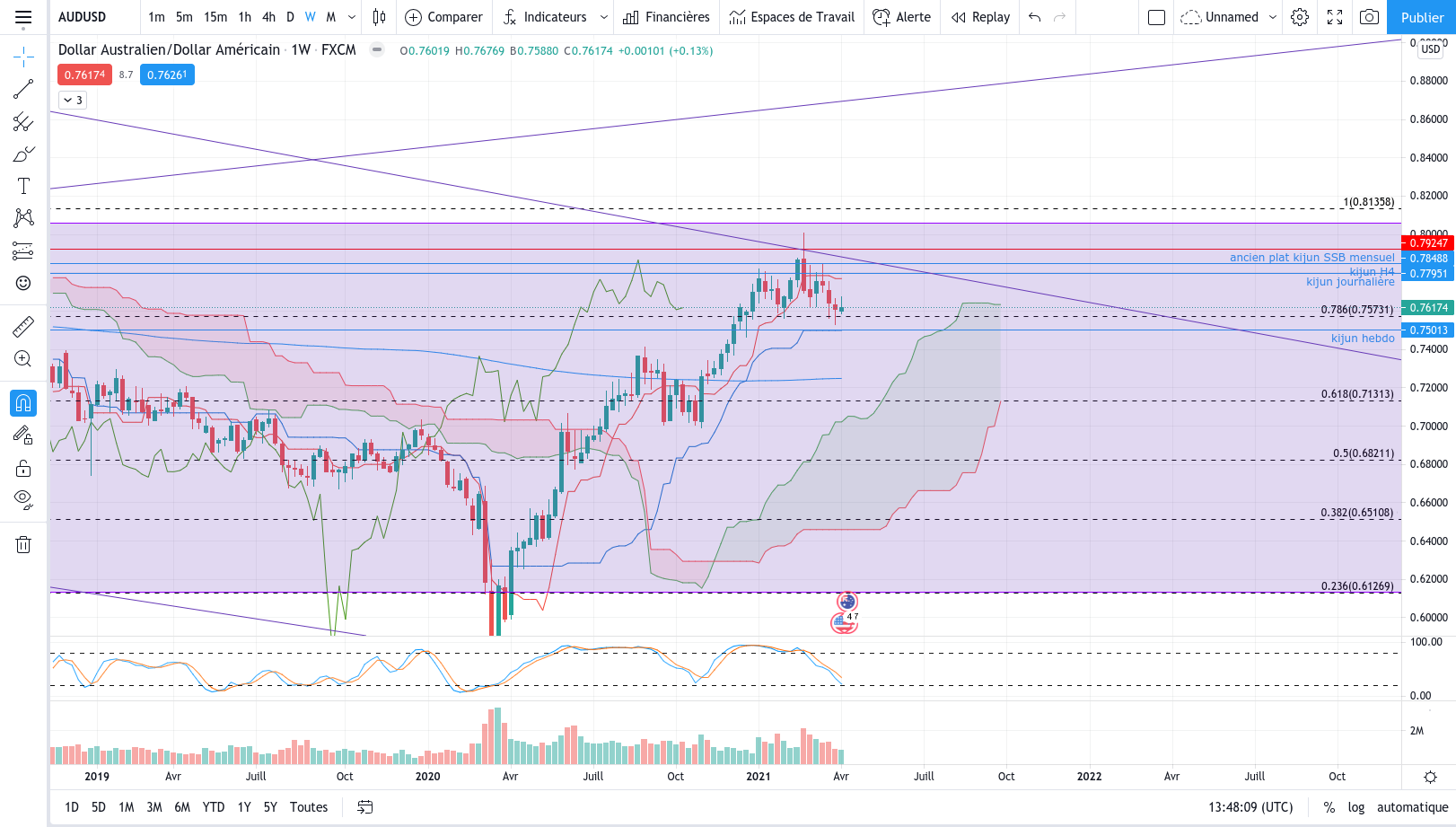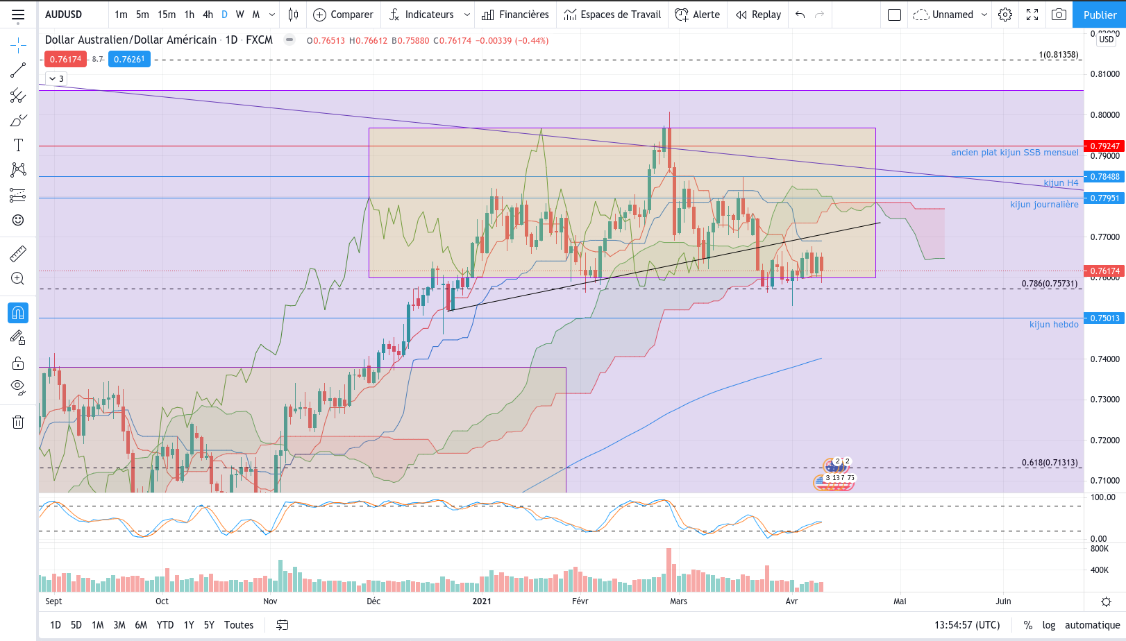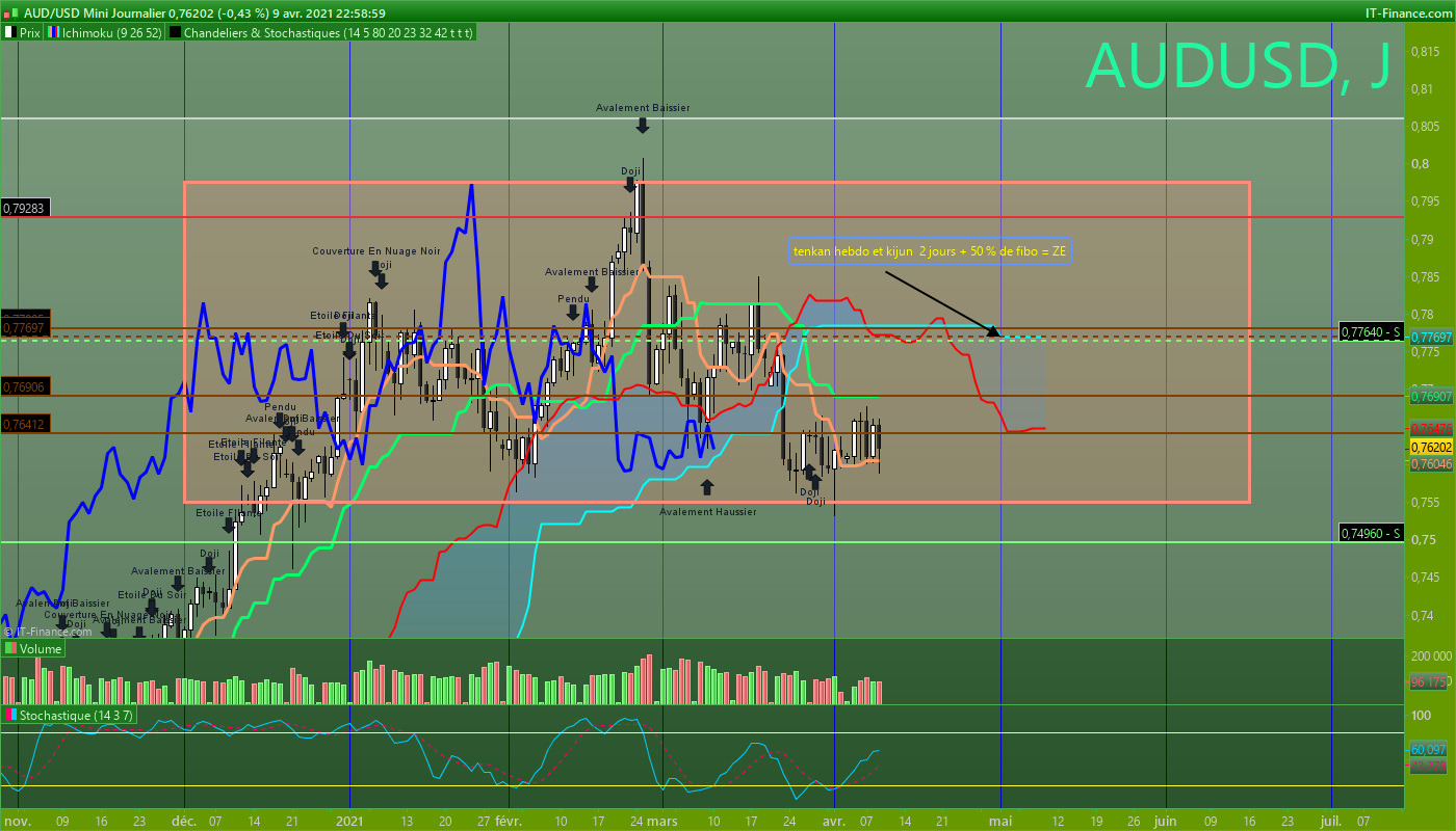 Pas grave. Je maintiens la position en visant la kijun daily. Et selon la réaction sur celle-ci, j'aviserais <=> Si ça résiste, je sortirais. Et si ça cède, mes objectif son ces seuils identifié en H4 : 0.76592 (ext kijun)/ 0.77067 (plat SSB) / 0.78495 (ext SSB/KJ) et peut-être haut de range D1. Je surveille un potentiel canal ou fourchette d'andrews en H1 qui me serviras aussi pour la suite à donner.