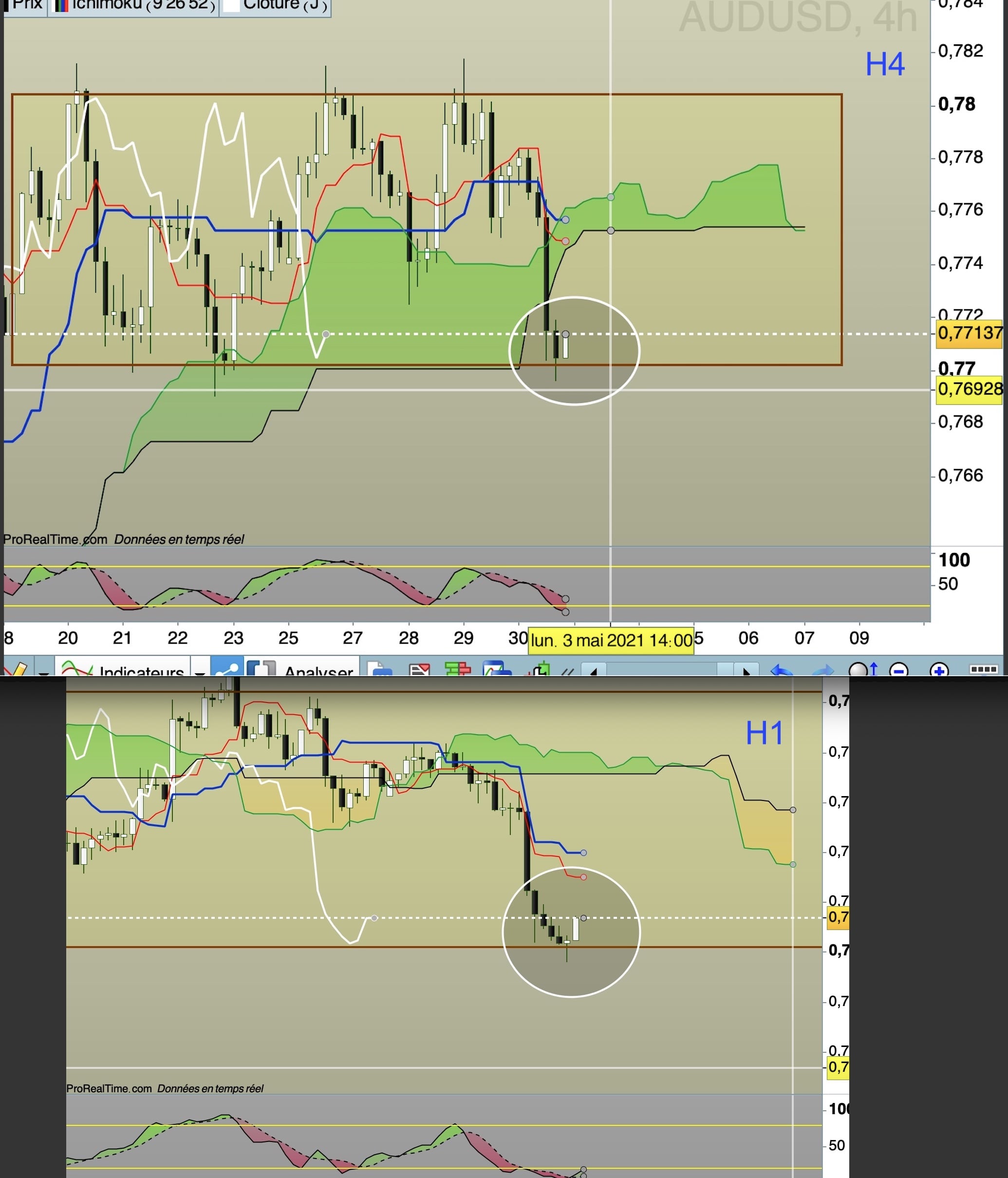 Tu as raison, effectivement ce range H4 (image du haut) est très beau, d'autant plus que si l'on regarde en H1 (image du bas), on a un très beau signal d'achat avec cette magnifique étoile du matin.