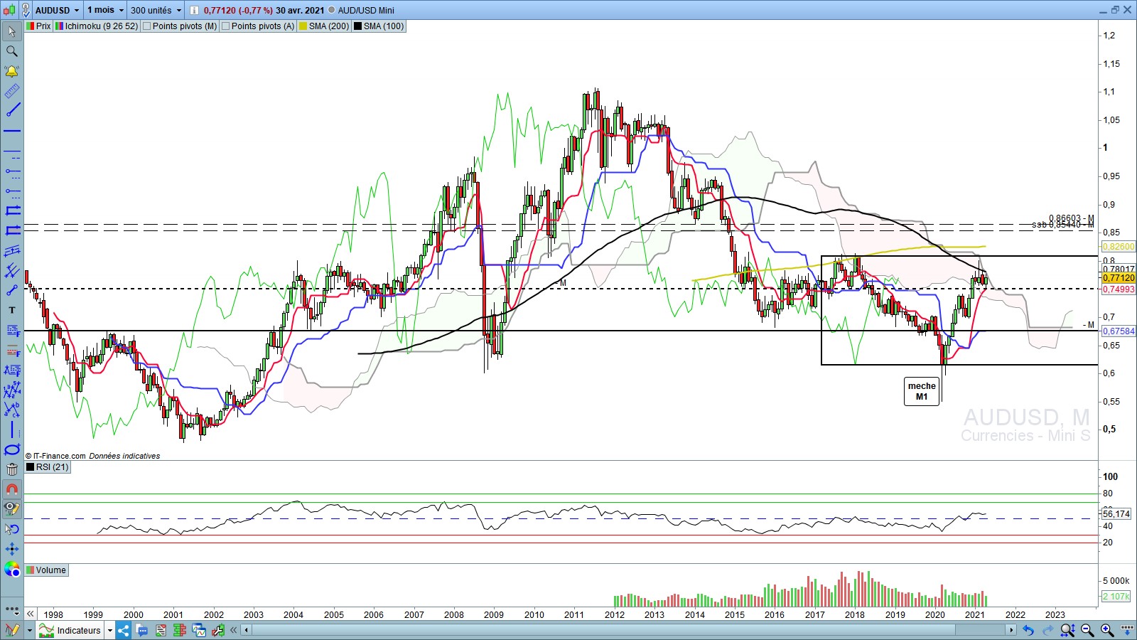GRAPH HEBDO => On constate que le prix travaille une extension plat kijun qui joue parfaitement son rôle de résistance. Celle-ci pourrait nous renvoyer vers le support prix/plat kijun à 0.7413.