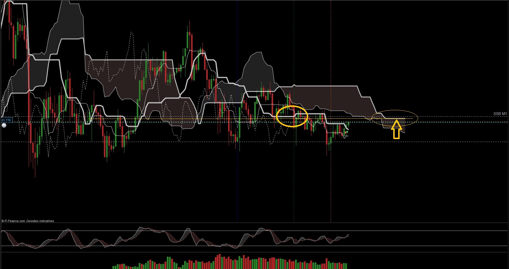 En hebdo, les prix sont certes soutenus par la tenkan dans ce beau mouvement haussier, mais ils sont au contact d'un niveau qui a beaucoup fait travailler les prix. Je pense donc qu'entrer long sous ce niveau présente un risque.
