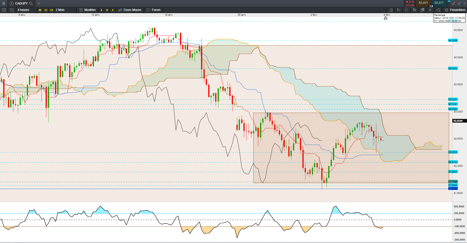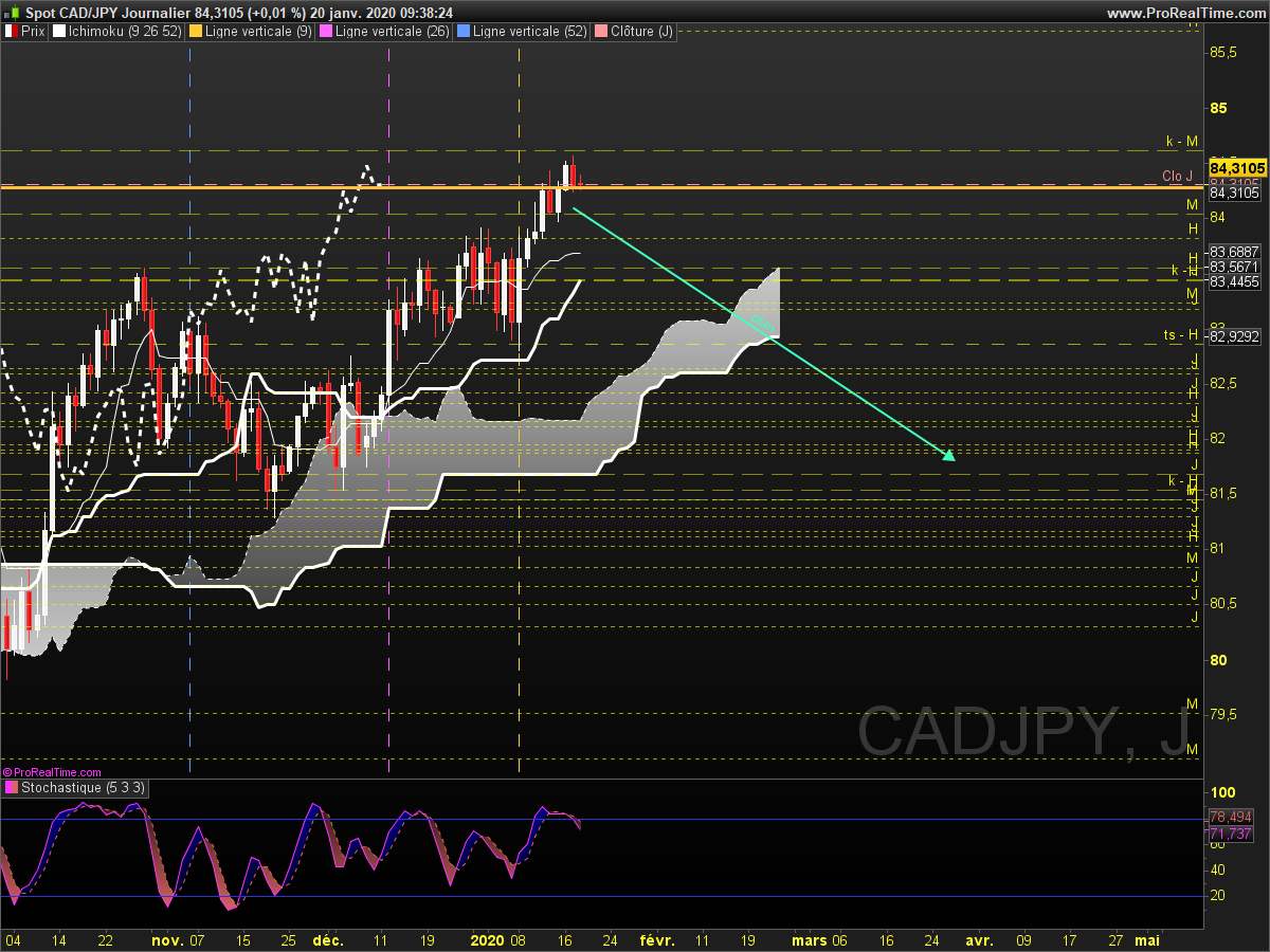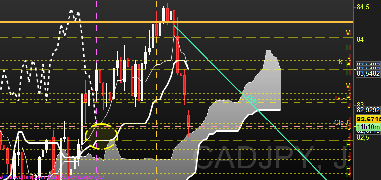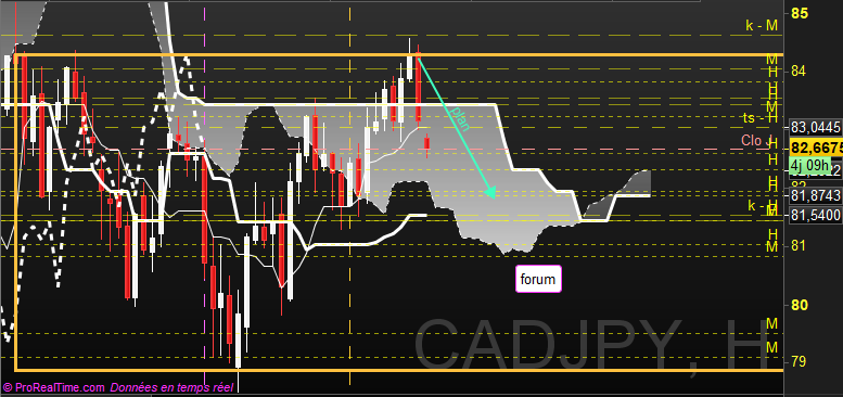 En H4, j'avais du mal à bien définir la borne basse. Quelle qu'elle soit, elle a été cassée (de peu) sur mes graphs. On voit que la kijun est au contact des prix et qu'elle a bien effectué son rôle de résistance à la première tentative
