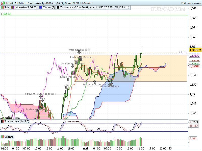 je suis donc en accord avec toi sur un plan long retour vers kijun daily, mais je pense que tu as négligé le H1 en te concentrant sur le m15. On voit ici la pertinence des lignes ichimoku dans une analyse multitimeframe. Donc oui, je coirs que cette tenkan daily va céder, donc que le range H1 cassera par le nord, mais en trading, ce qu'on croit est souvent influencé par ce qu'on voudrait, donc il est impératif de rester factuel et donc de considérer tout ceci avant de cliquer (tu peux cliquer sur une petite UT à l'intérieur de ce range H1 si ta conviction est haussière et que les résistances vont céder, mais tu ne dois pas le faire si tu n'as pas pris ces éléments en compte.