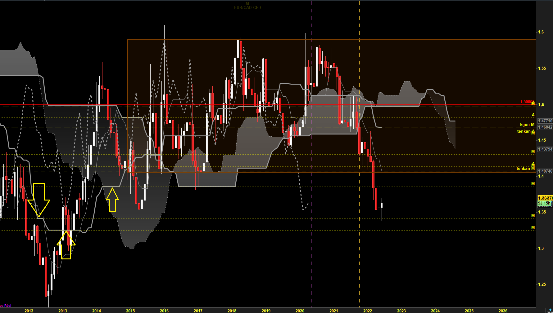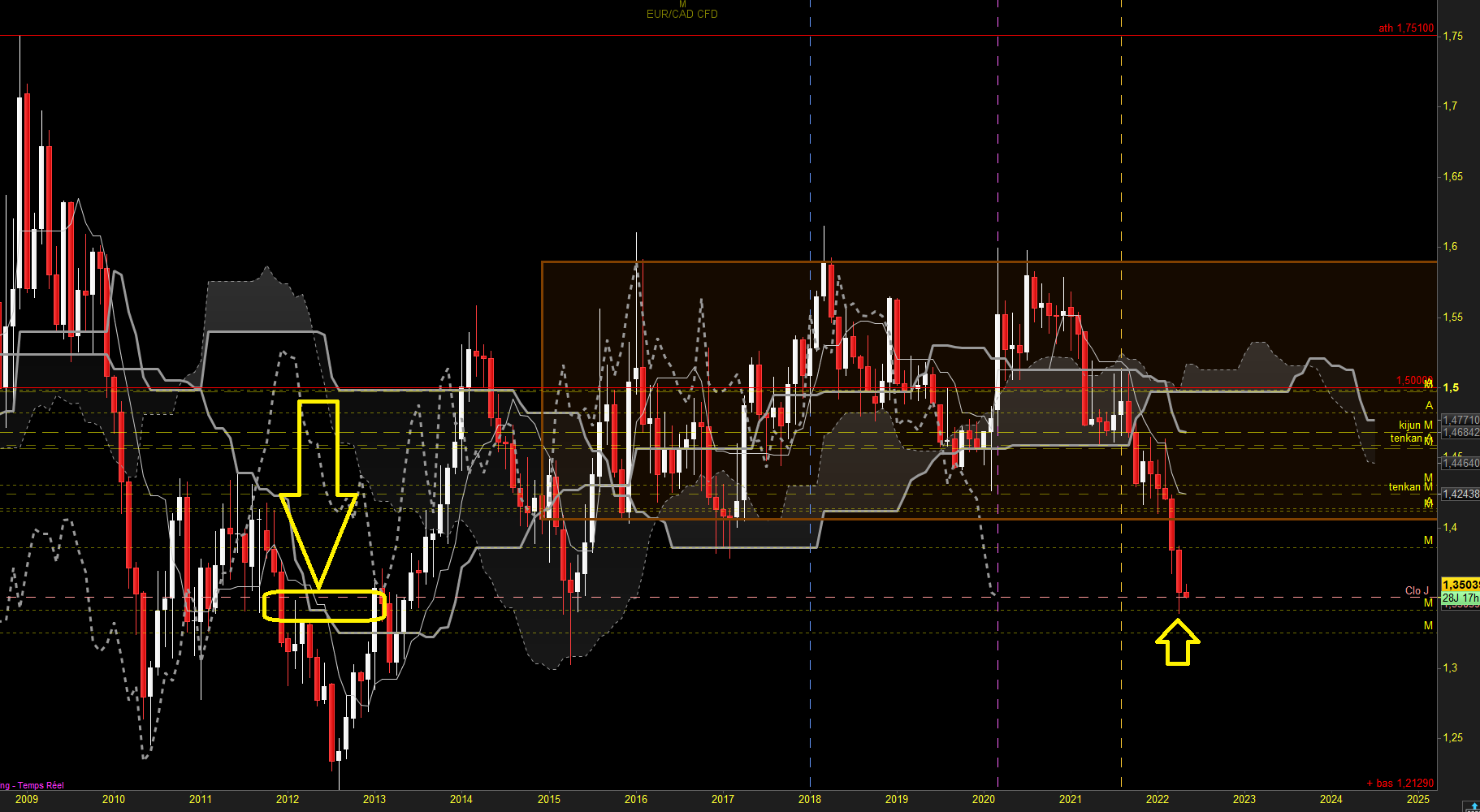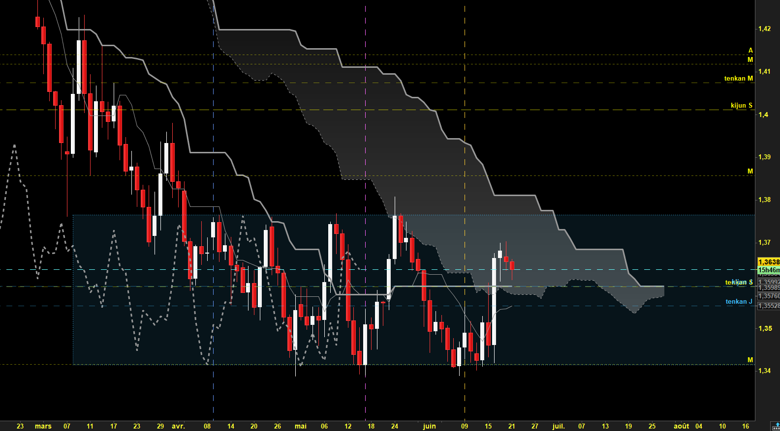 H1: je définis un range avec le support mensuel en bas et la tenkan daily en borne haute. Sa cassure par le haut validerait le plan long vers kijun daily