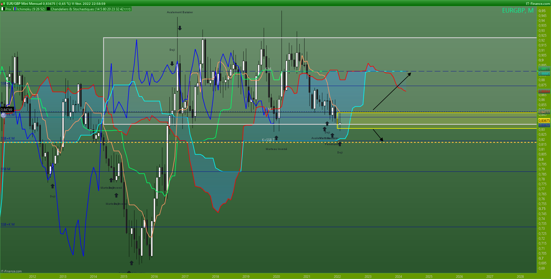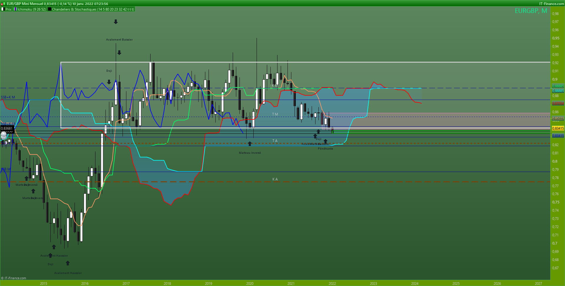 en mensuel, je vois 2 ranges: un très large et un étroit (qu'on peut tracer aussi en hebdo) dont les prix travaillent la borne basse. ils sont actuellement au contact de la SSB qui correspond à la tenkan annuelle