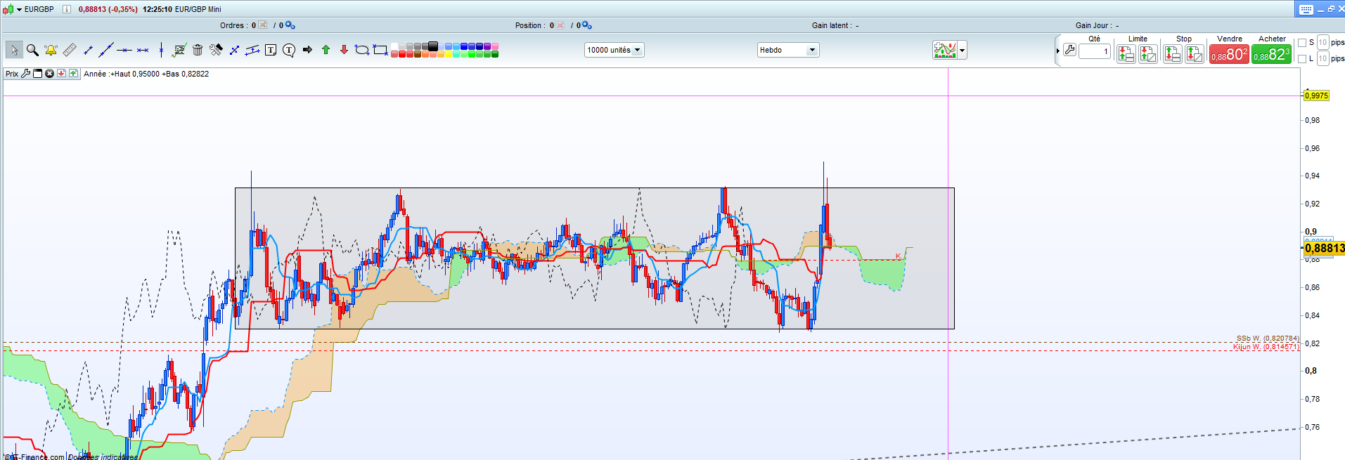 Quand on trade il faut prendre en compte les UT supérieures afin de bien comprendre le mouvement, définir des S/R... Il est aussi précisé que les infos des Ut supérieures priment sur les infos des Ut inférieures. Donc si je suis ton raisonnement, tu as dû tracer un range hebdo comme ceci (une tendance s'arrête toujours sur la borne d'un range), et comme ton plan est haussier, ton objectif pourrait être le haut de ce range. Les prix sont en train de casser la ZE, mais le surachat est présent et comme expliqué dans la formation, il faut attendre un throwback avant d'entrer long afin de réguler ce surachat et éviter d'entre dans cette zone: idéalement entrer long une fois qu’elle a été cassée, que la respiration à eu lieu et que les prix sont revenu au-dessus.