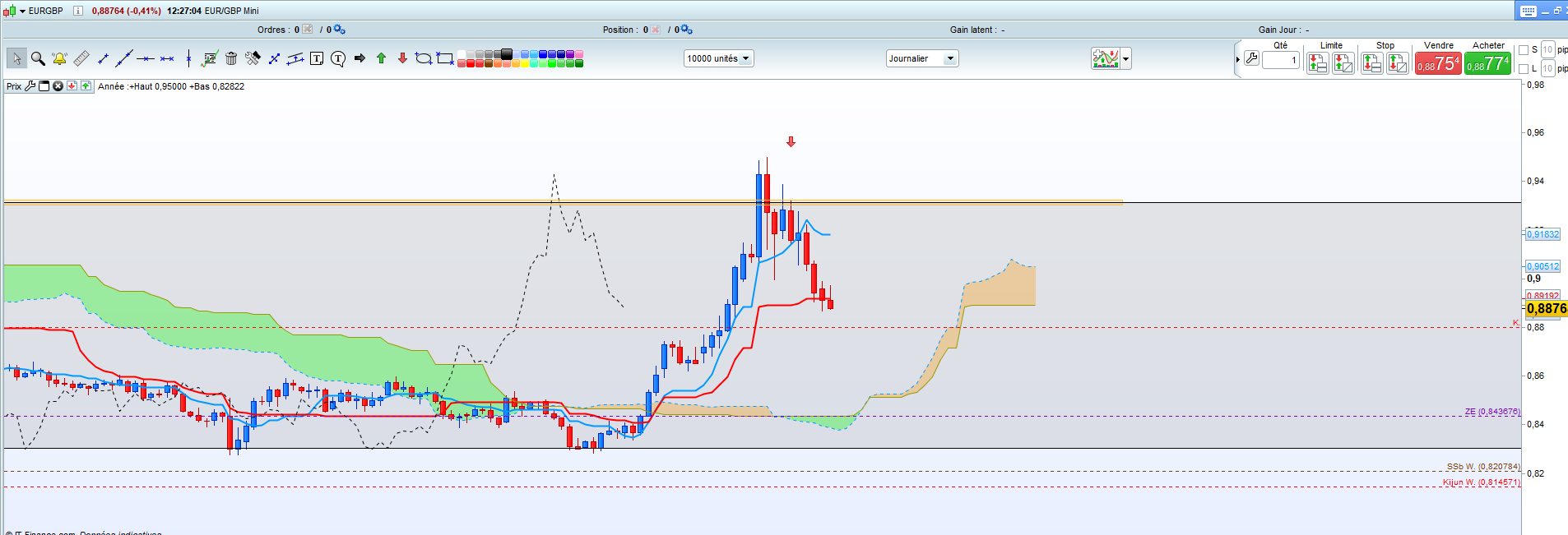 Pour résumer, je dirais que même si on ne regarde que le H4, la tendance est haussière, mais surachat, il faut donc chercher une entrée longue après throwback (respiration baissière). la force d'Ichimoku est son analyse multitemporelle et les grandes UT indiquent de ne pas entrer long pour le moment. D'un avis personnel, je serais même plus tenté de chercher une entrée à la vente, mais c'est contre-tendance et donc risqué: on ne sait jamais jusqu'où la respiration s'effectuera. Donc pour te répondre concrètement et selon la formation de Patrick: non: il ne faut pas acheter maintenant mais attendre que les prix reviennent à la baisse puis surveiller un signal de retournement haussier.