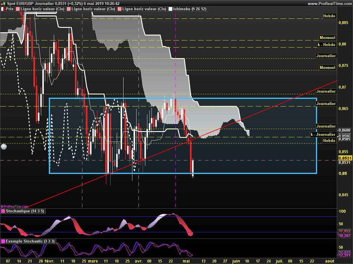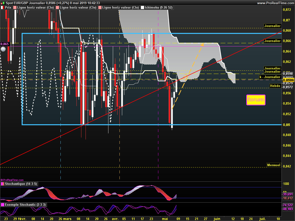 Journalier:La bougie journalière qui n'est pas encore clôturé travaille la tenkan, la kijun, mais a également comme résistance le niveau de 23% de fibonacci du range Hebdo.