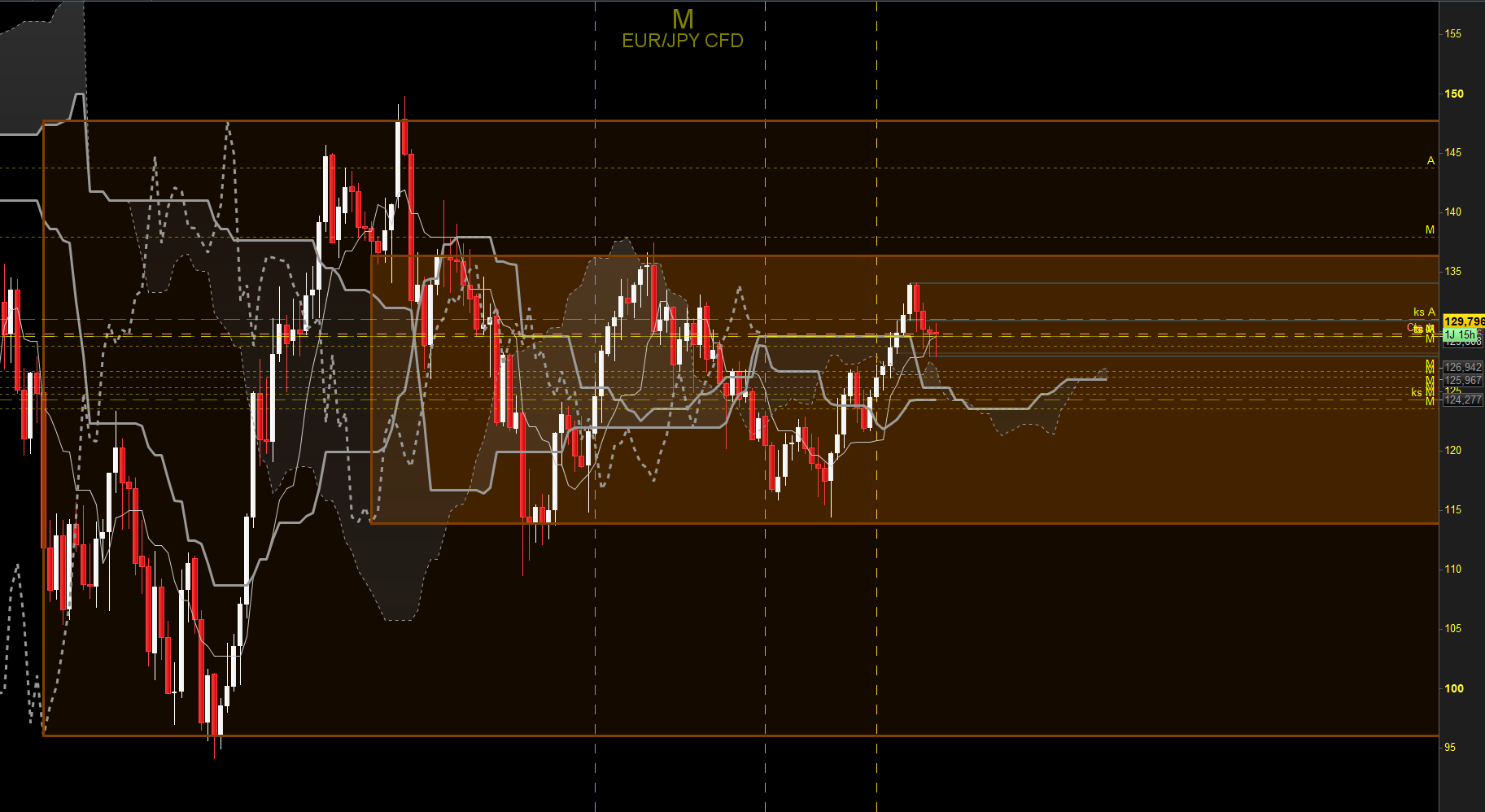 en mensuel, les prix semblent se diriger vers le haut du range, ils sont soutenus par la tenkan et on voit la chikou au contact de son support SSB, et les prix forment un marteau pour le second mois consécutif, ce qui montre l'échec des vendeurs malgré les tentatives: tout ceci ne m'indique guère de chercher des ventes tant que les supports tiennent