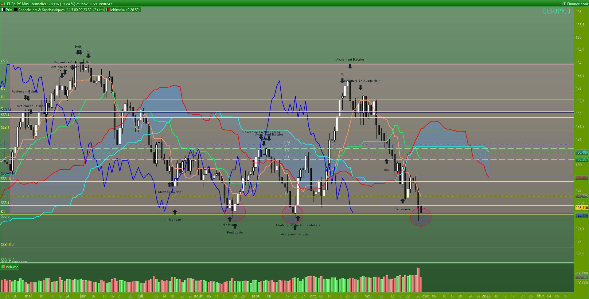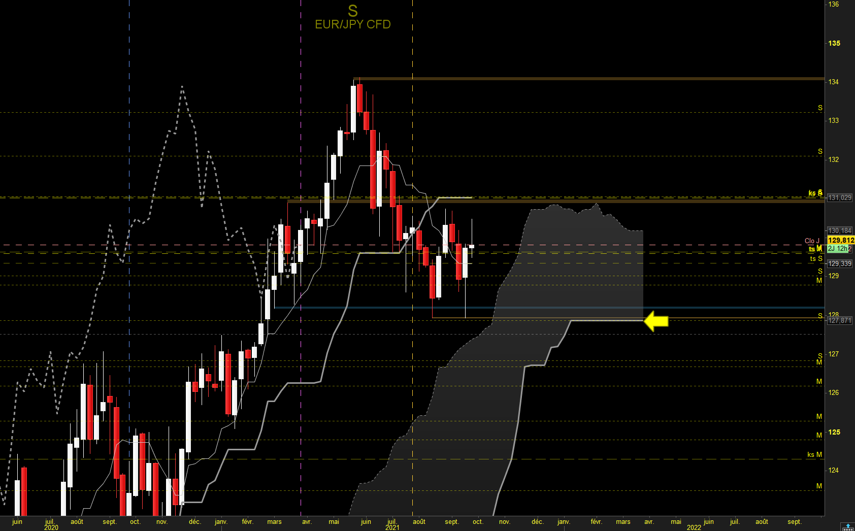 hebdo: la tendance haussière a été remise en cause avec la cassure de kijun et tenkan par les prix, mais ils se sont arrêté sur le niveau de plat SSB futur qui a repoussé les prix 2 fois. Ils ont cassé la tenkan et se dirigent vers la kijun. la cassure de cette dernière par le haut validerait définitivement le retour de la tendance haussières sur cette UT (dans le sens de la vision mensuelle)