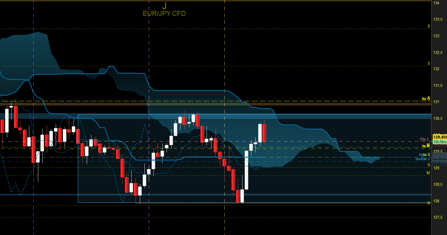 en daily, le range est selon moi établi, mais sa borne haute ne m'intéresse guère car elle est juste sous la kijun hebdo, et donc vendre la borne haute de ce range me semblerait risqué si près d'une résistance si forte. n voit que les prix réagissent sous une zone de prix (en bleu) et baissent aujourd'hui, mais l'idée de fond reste valide tant qu'ils sont dans la partie supérieure de ce range.