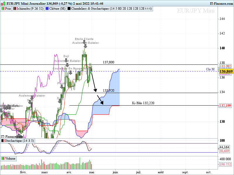 En journalier après deux journées d'accélération baissière, les prix ont buté sur un support Dly (gap des 135.35 environ) puis sont remontés testé la Ts (cassée puis reprise). Actuellement ils travaillent la Ks Dly qui est orientée.