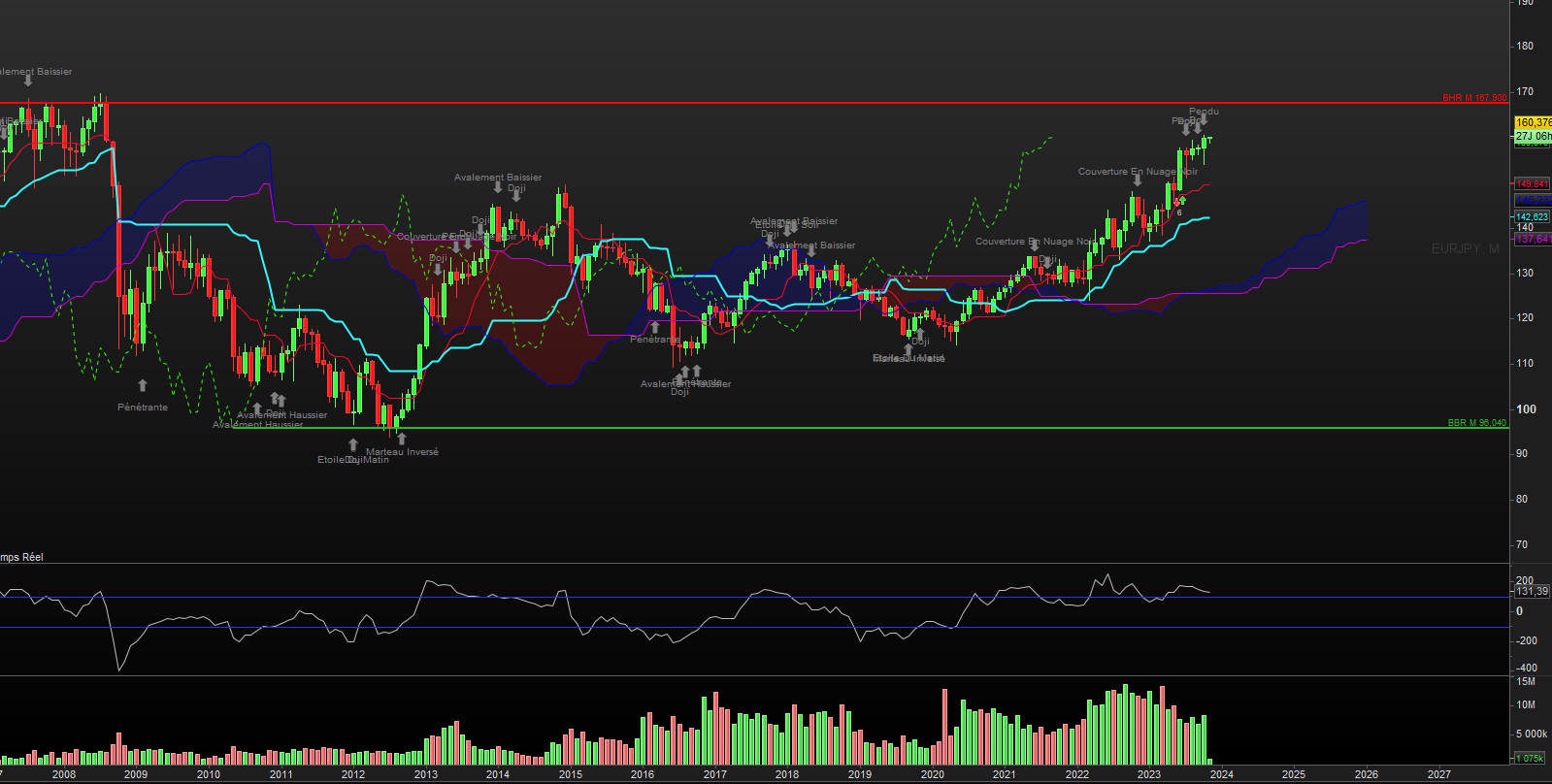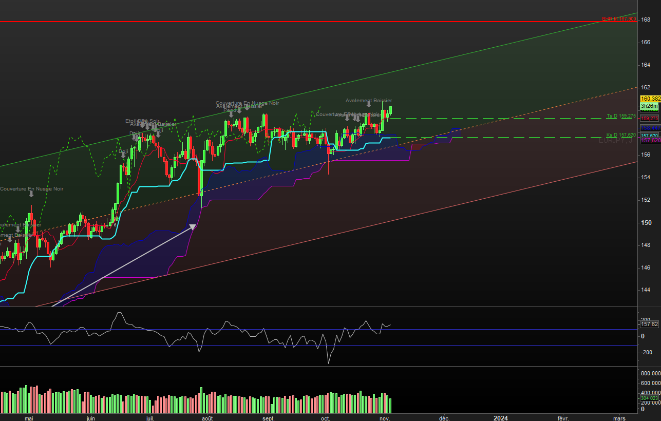 Je surveille donc le prix en journalier pour voir sa réaction sur le [range] journalier et je pose une alarme pour voir les réactions sur le niveau 148/150 si le prix venait à y aller