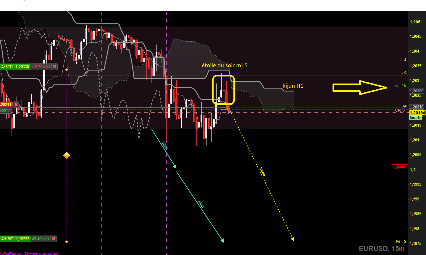suivi: le range a été cassé, pullback jusqu'à kijun H1 où une étoile du soir m15 s'est formée: ça se tente