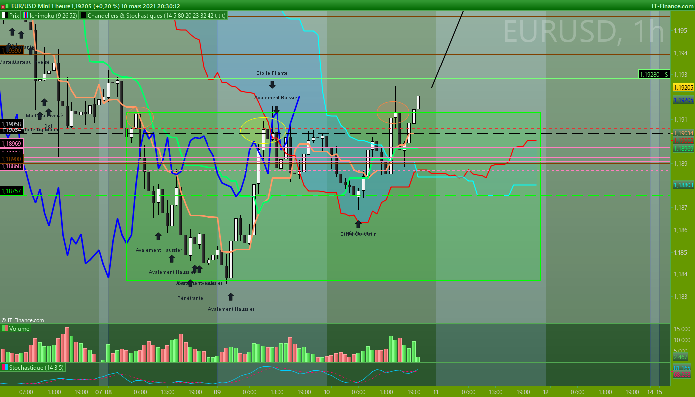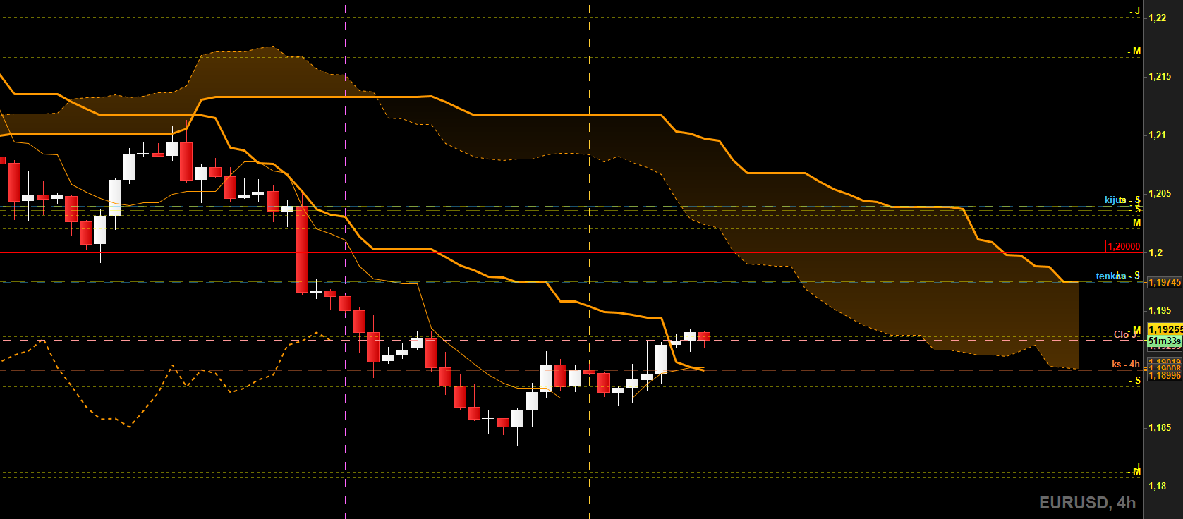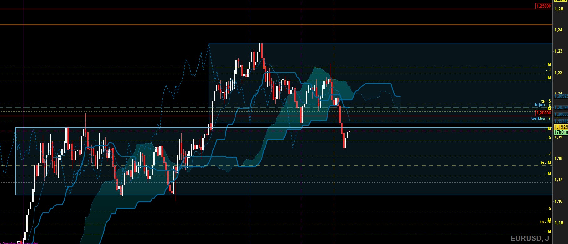 Le plan intraday est simple: si cassure du range H1 par le haut, on pourrait aller chercher 1.1975 qui se trouve être la kijun hebdo, la tenkan daily et le bas de l'ancien range daily. Sio cassure par le bas, ça voudrait dire reprise de la baisse et on pourrait viser alors la tenkan mensuelle (mais attention au niveau 1.181 où j'ai 2 niveaux de supports mensuel - pointe de chikou - et daily - ZE de l'ancien range).