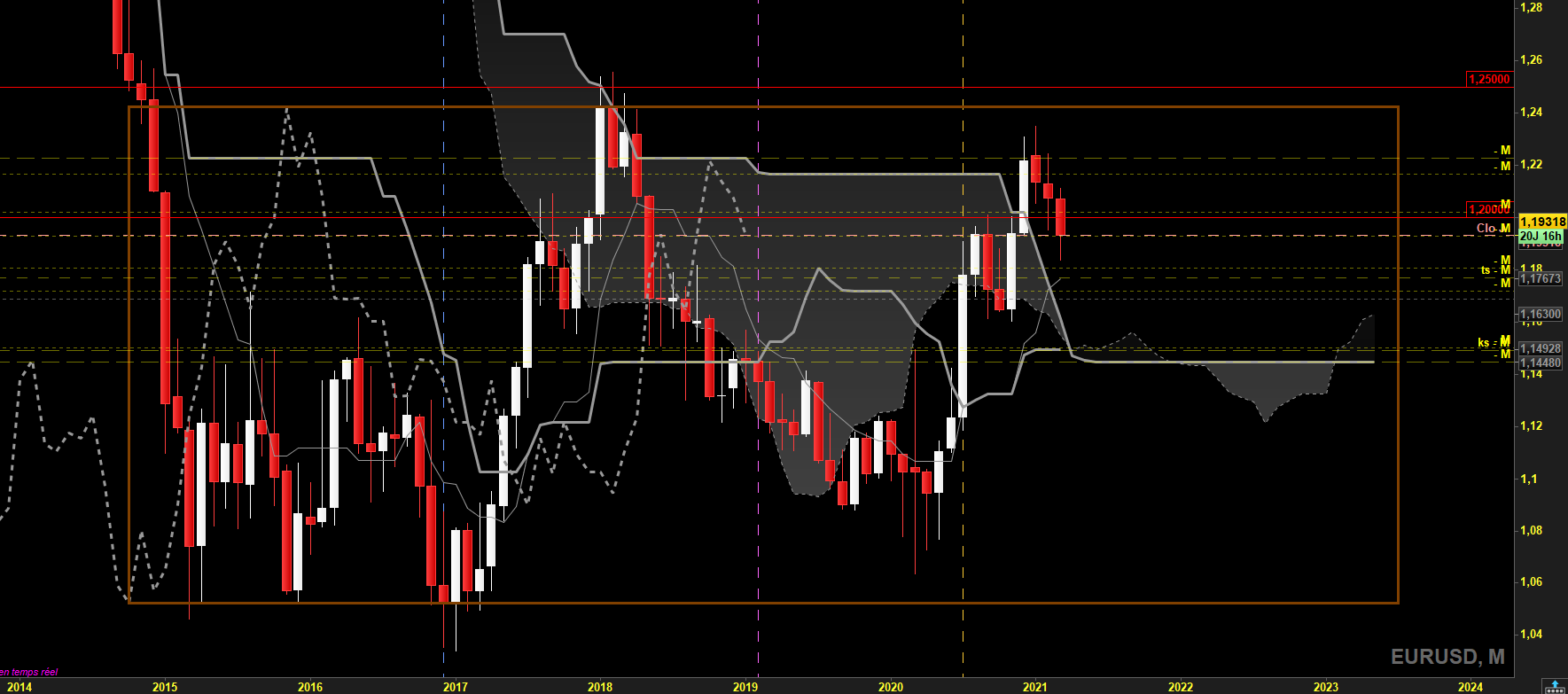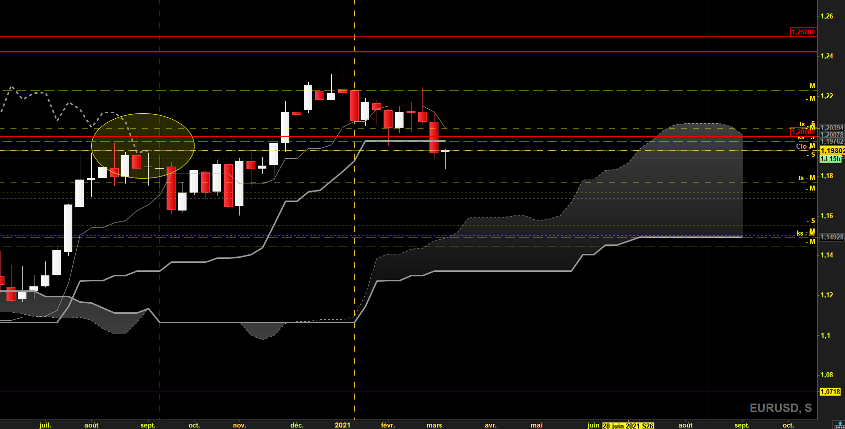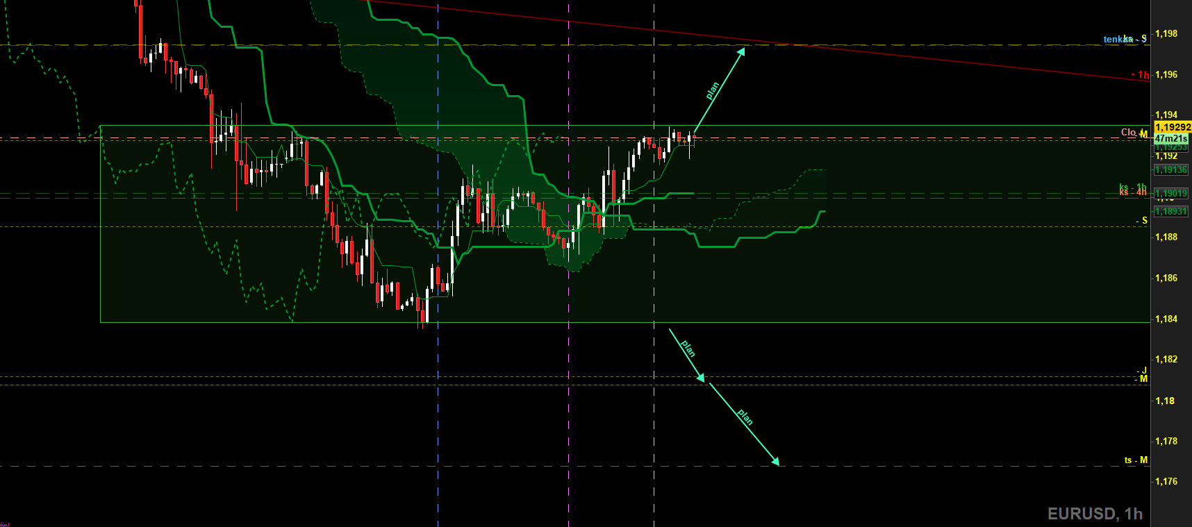Le plan intraday est simple: si cassure du range H1 par le haut, on pourrait aller chercher 1.1975 qui se trouve être la kijun hebdo, la tenkan daily et le bas de l'ancien range daily. Sio cassure par le bas, ça voudrait dire reprise de la baisse et on pourrait viser alors la tenkan mensuelle (mais attention au niveau 1.181 où j'ai 2 niveaux de supports mensuel - pointe de chikou - et daily - ZE de l'ancien range).