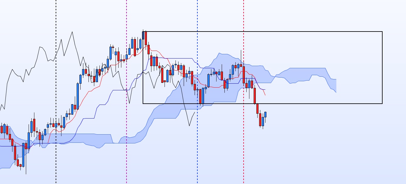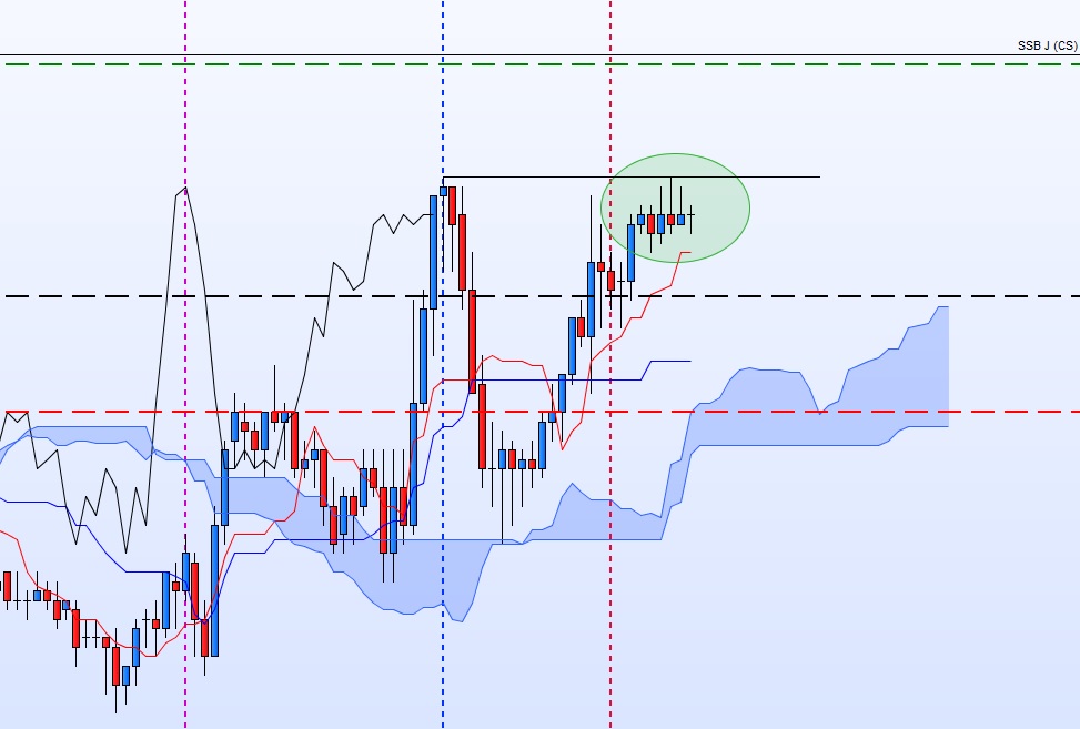Puisque c'est la file intraday, il faut regarder dans le détail et on voit en H4 que la kijun a été cassée par le haut (donc affaiblissement dans la tendance baissière), mais chikou devra casser les prix pour une remontée