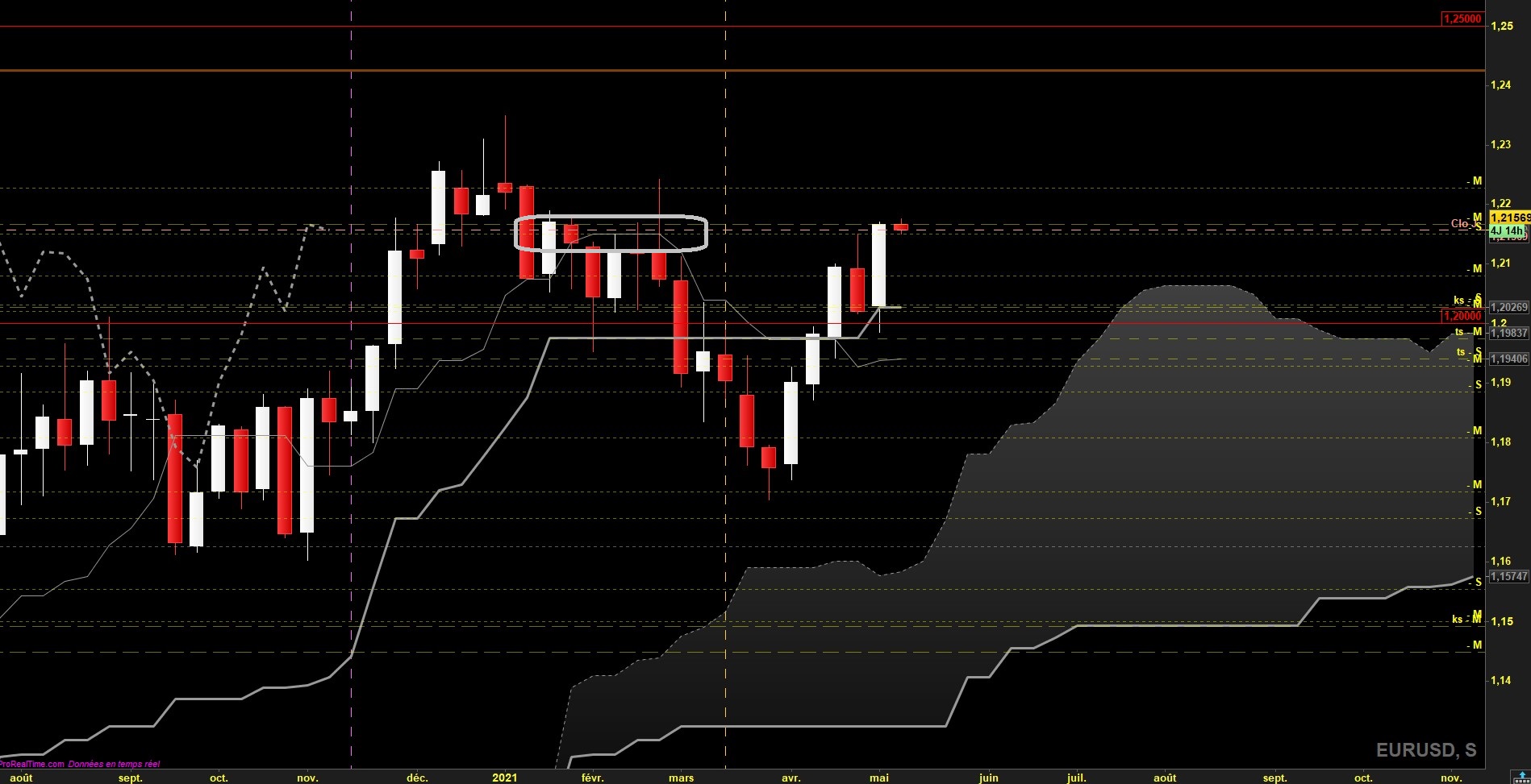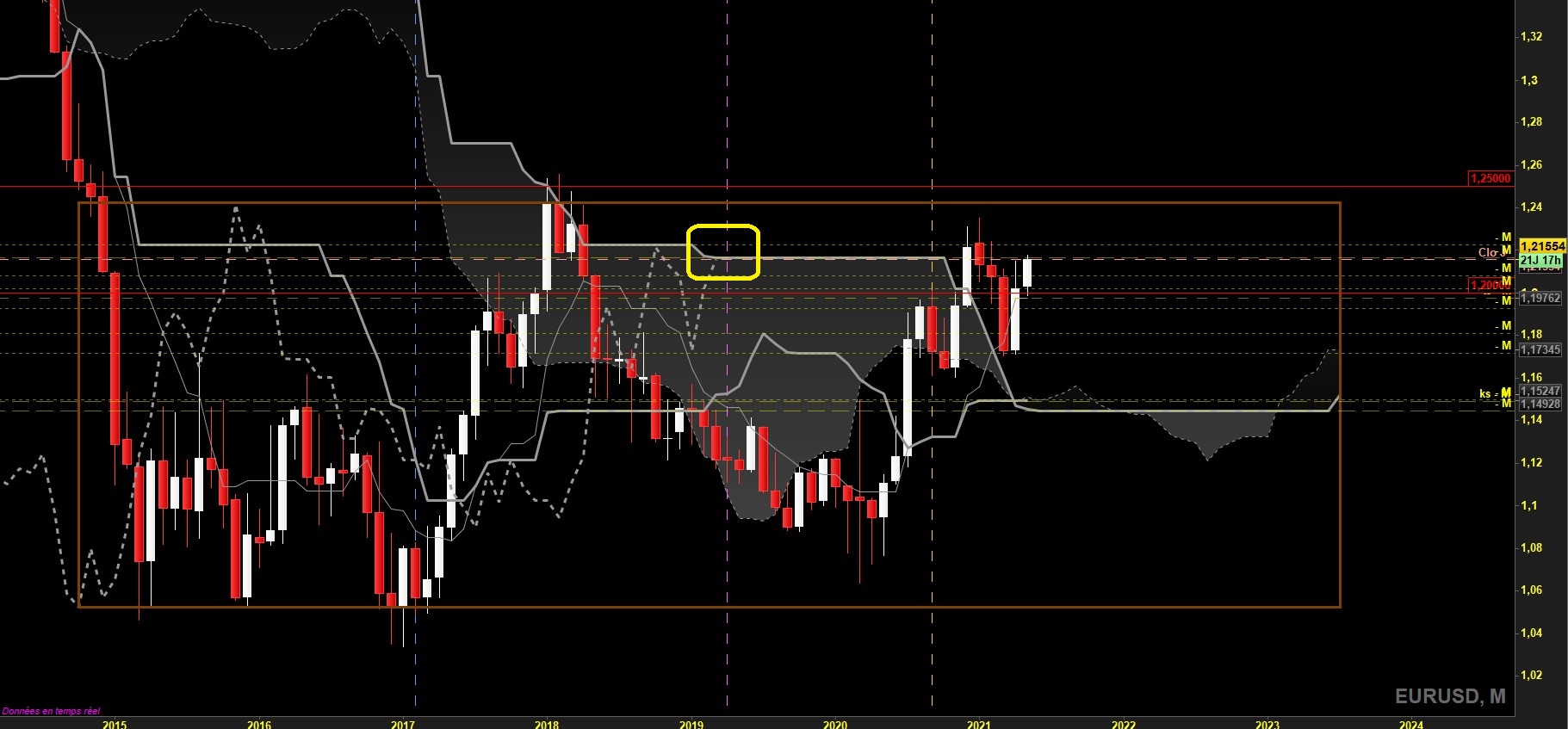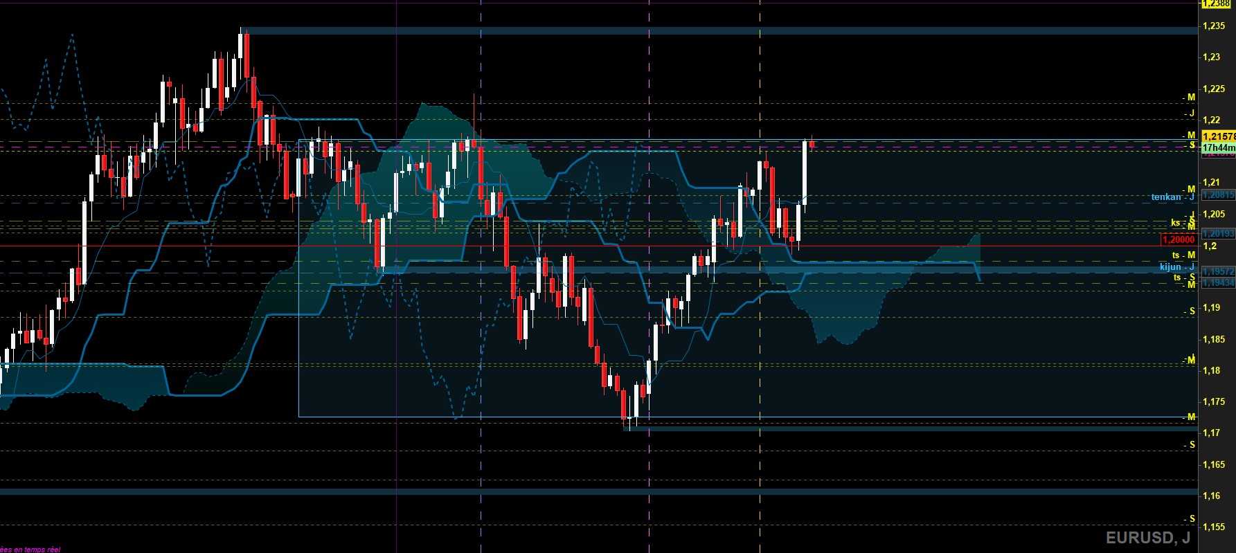 la cassure de l'un d'eux donnera le sens à trader. Si c'est le niveau de tenkan hebdo, on pourrait observer alors un retournement sus le haut de range daily avec les objectifs shorts habituels en swing, et les kijun H1 et H4 en TP intraday. Si c'est la SSB mensuelle qui cède, alors on pourrait voir le retour haussier avec le niveau 1.22 en TP intraday (niveau de plat SSB mensuelle passée), et garder en swing avec 1.24 puis 1.25 en TP finaux (haut de range mensuel). Attention toutefois pour les achats (surtout en swing) car le surachat est très présent sur les UT moyennes daily, H4 et H1.