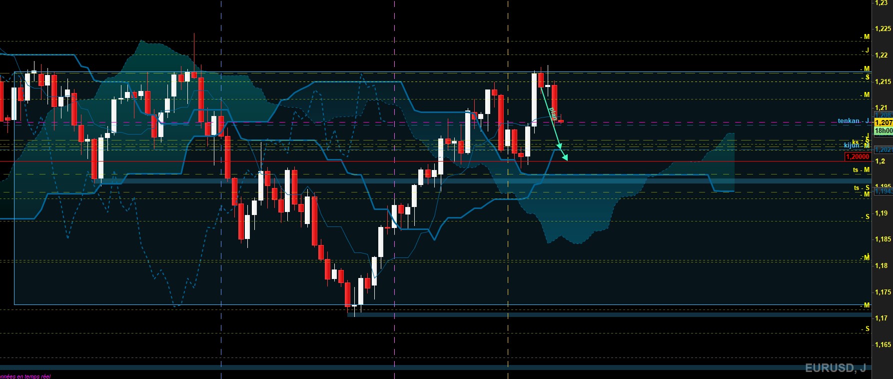 À affiner avec le H1 mais selon le sur-achat H4 pour une entrée Short vers la ZE ou on surveille la cassure de la résistance SSB Mensuel et la cassure de la Chikou pour éventuellement une entrée Long et ainsi pouvoir profiter de quelques points en Intraday.