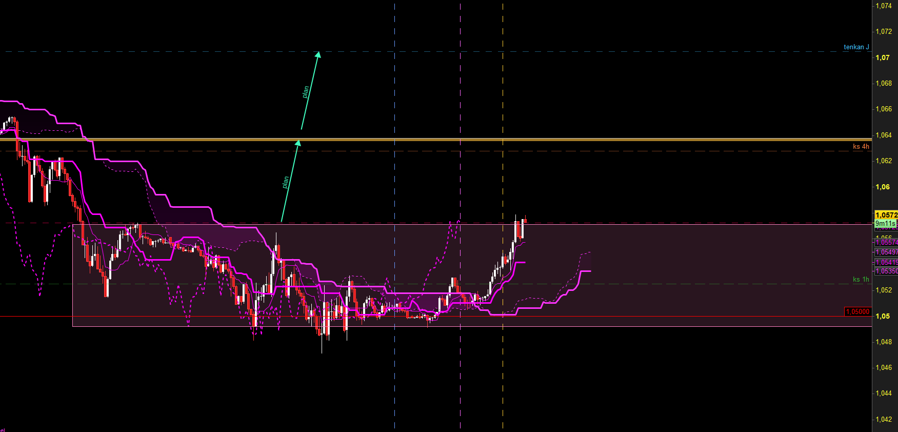 sa cassure validerait la cassure de kijun H1. le 1er TP serait la zone de prix hebdo déjà évoquée (je ne parle pas de la kijun H4 qui va baisser à la prochaine bougie, mais il faudra la surveiller quand même), et le TP 2 sera la tenkan daily (les + optimistes peuvent espérer transformer cet intraday en swing ou même en investissement)