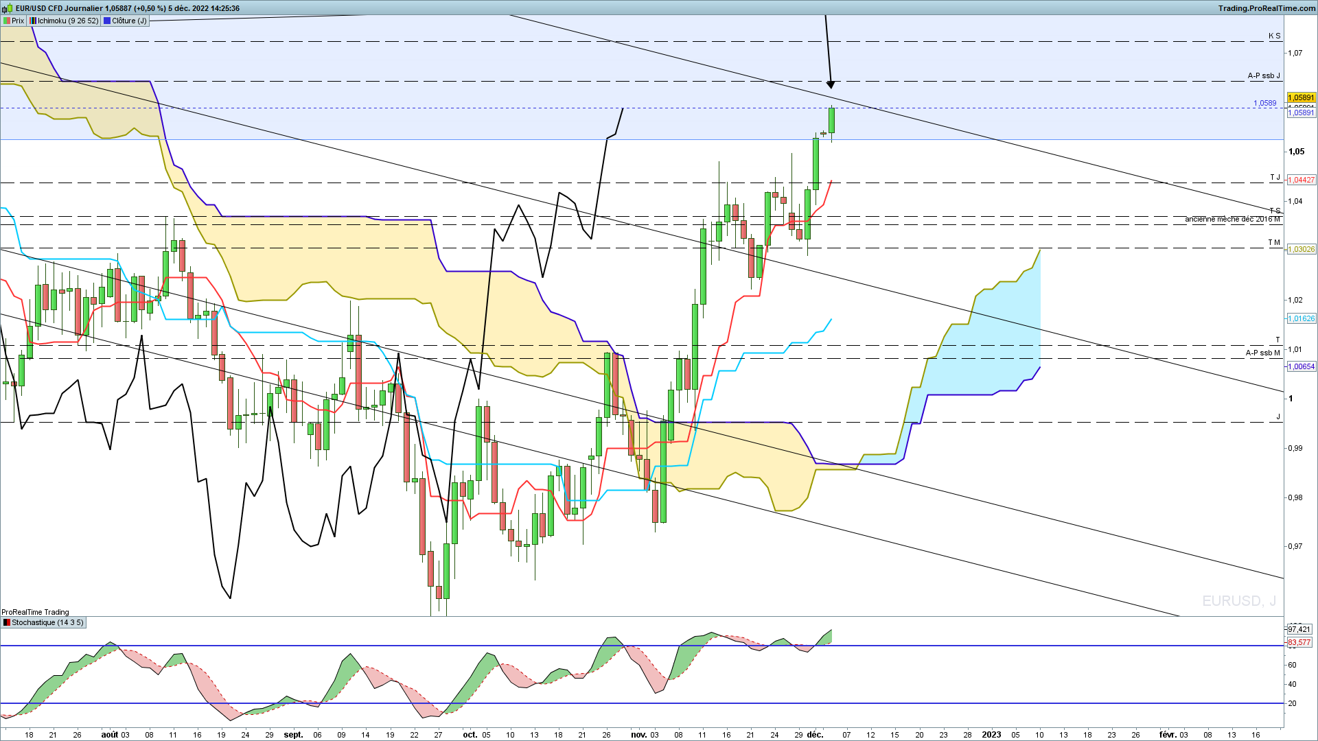 Le contact avec les grosses résistances au dessus des prix pourraient entrainer une correction pour résorber le sur-achat et créer un twist du nuage pour les faire entrer en range sur cette UT.