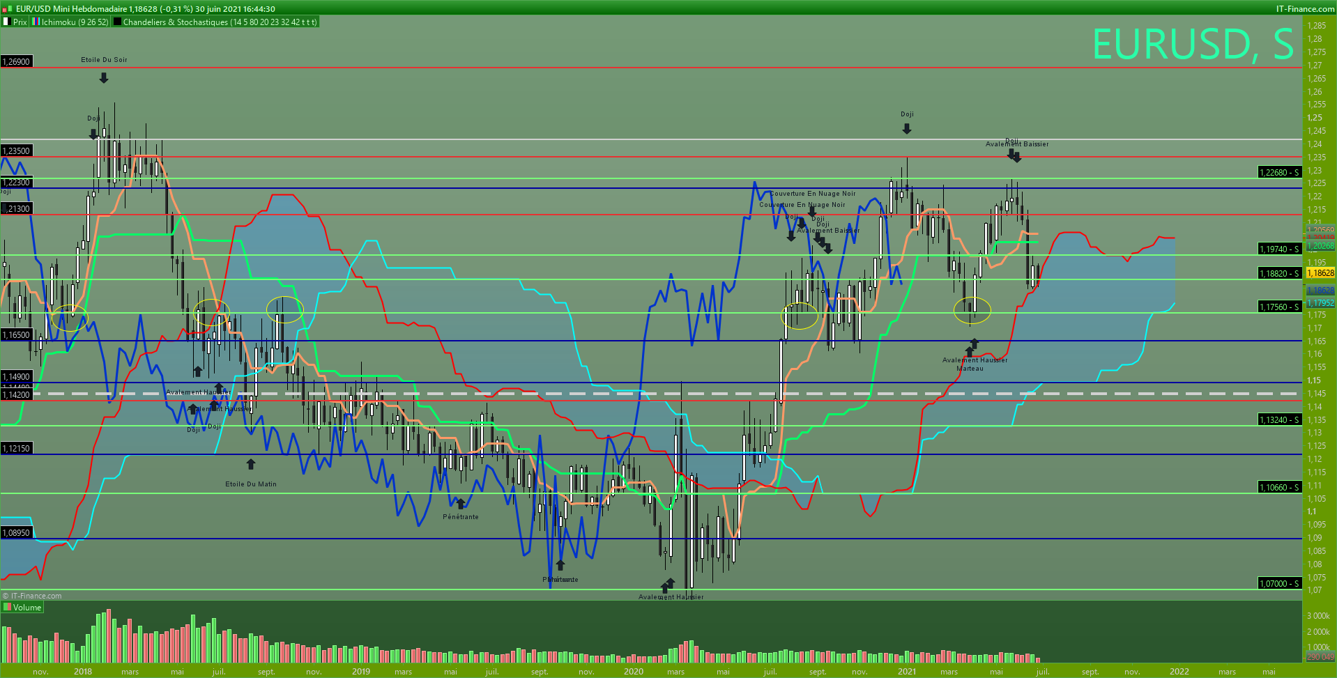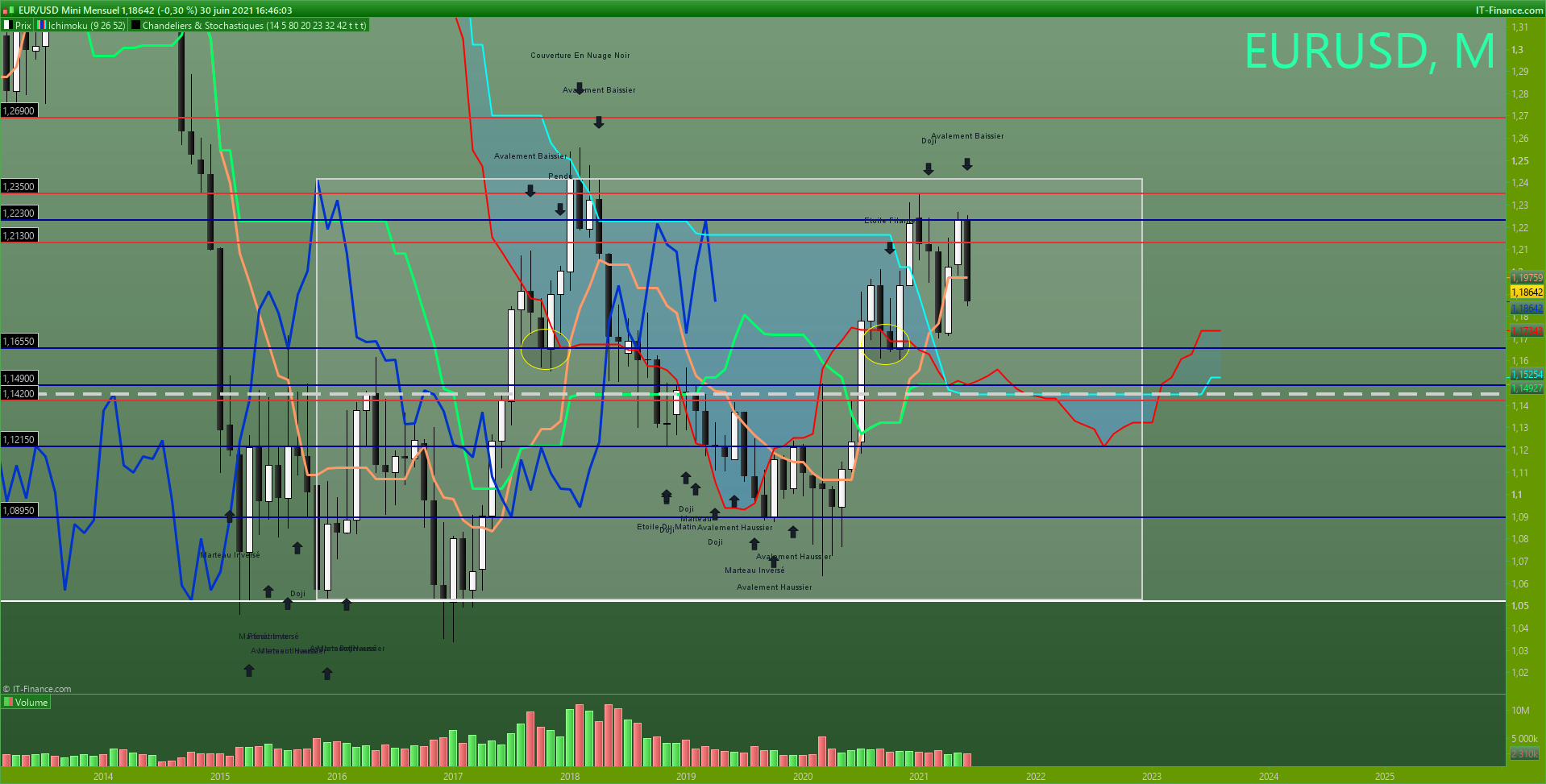 - si le range casse par le bas, on reprendra donc ma vision baissière (cf le mensuel) et je vois 1.17 en support (niveau de plat kijun passée mensuelle), puis 1.16 (niveau rond et support des prix daily, regardez le 28/09/2020 et le 05/11/2020), puis enfin 1.15 avec la kijun mensuelle.