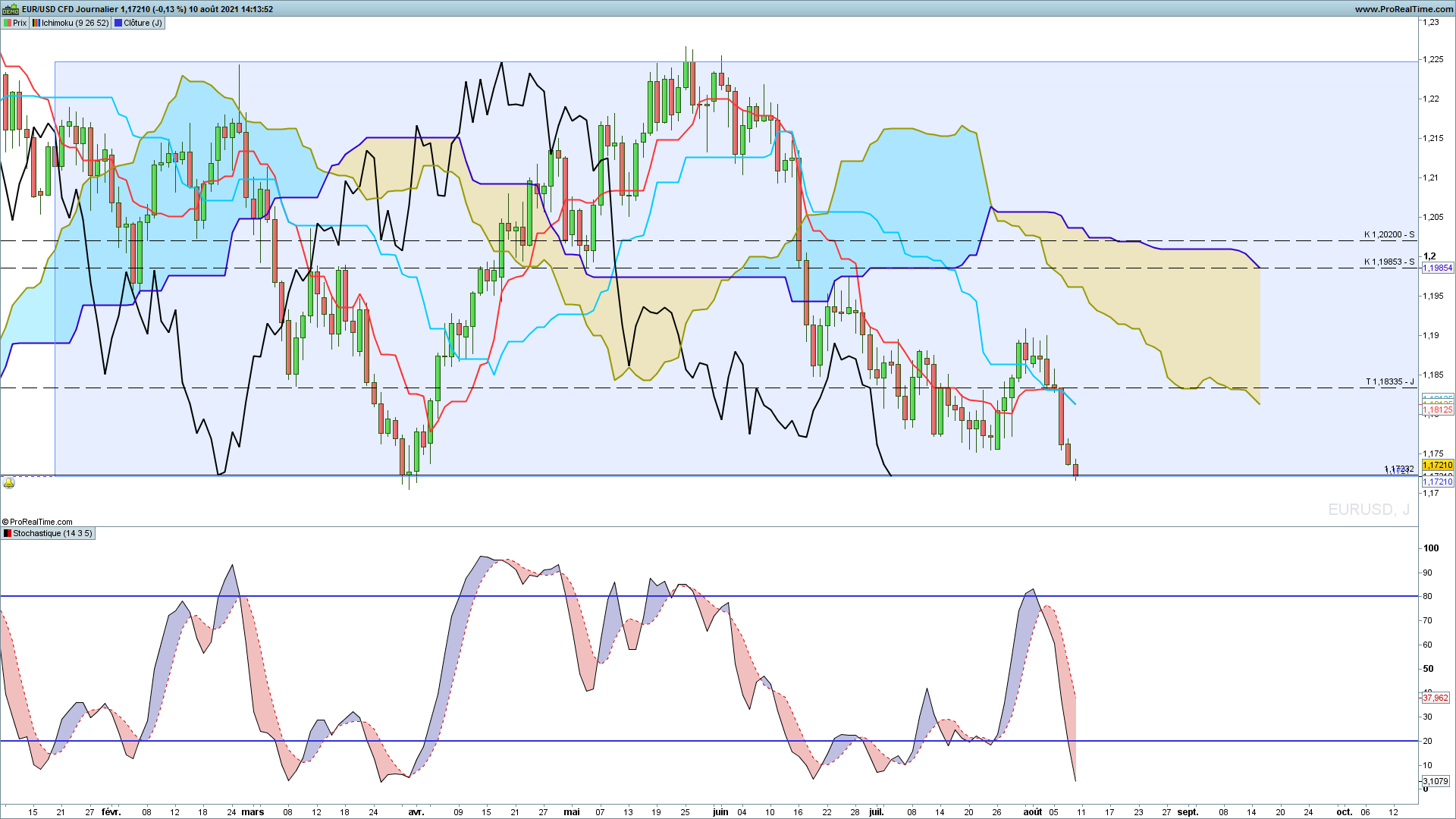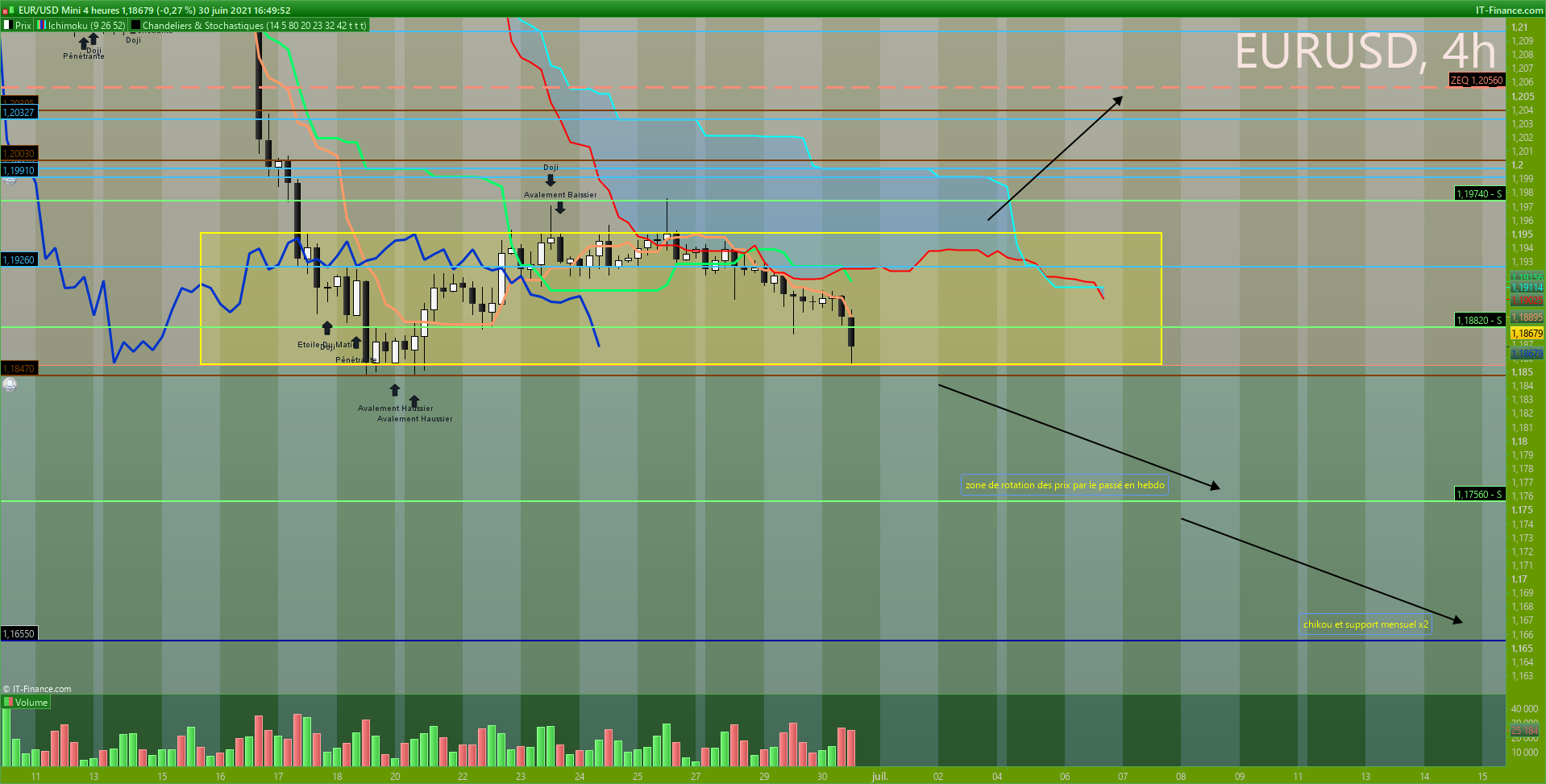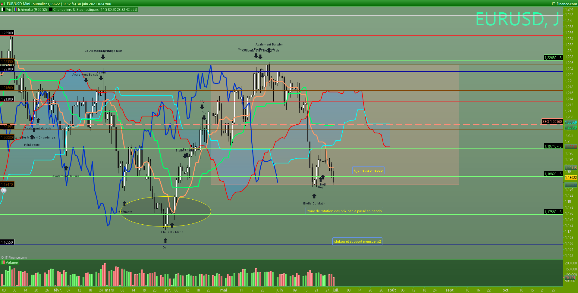 Bonjour, j'ai proposé ma vision sur eurusd hier lors de la revue de marché. Vous verrez que j'avais tracé un range H1 MAIS que la tenkan daily était juste au-dessus et qu'elle pourrait attirer les prix. Il me semblait donc prudent d'attendre sa cassure avant d'envisager un achat vers 1.2.