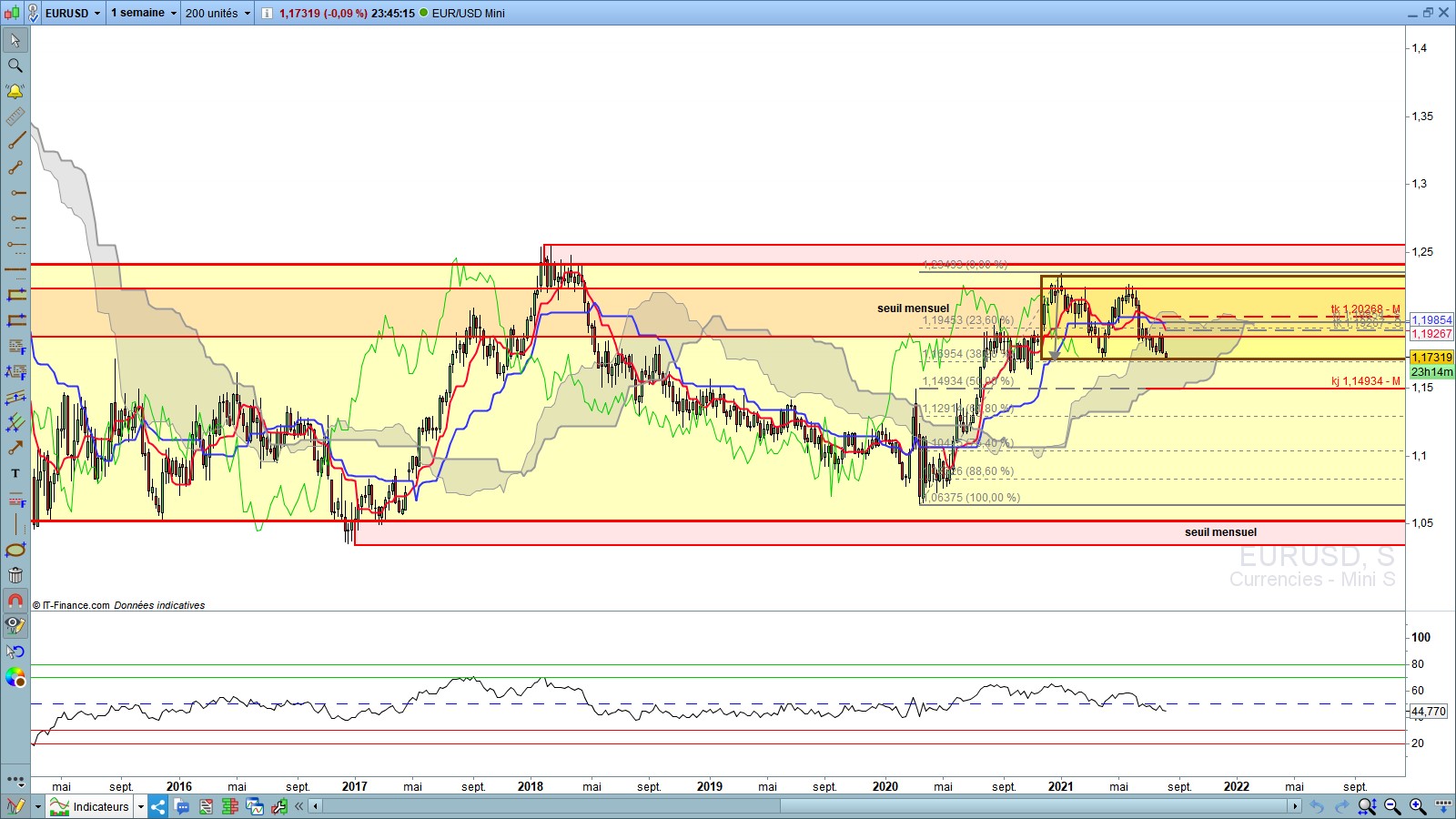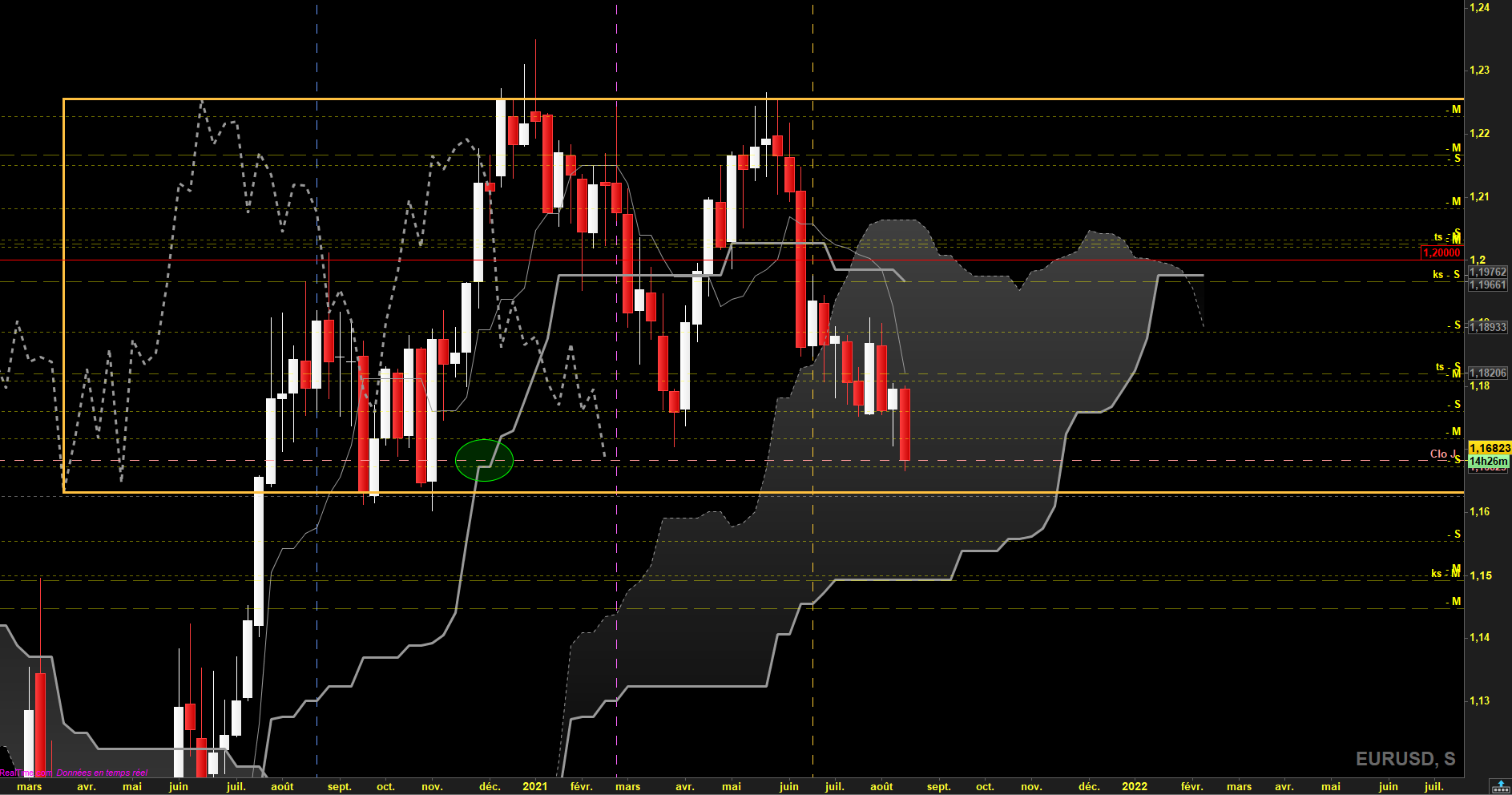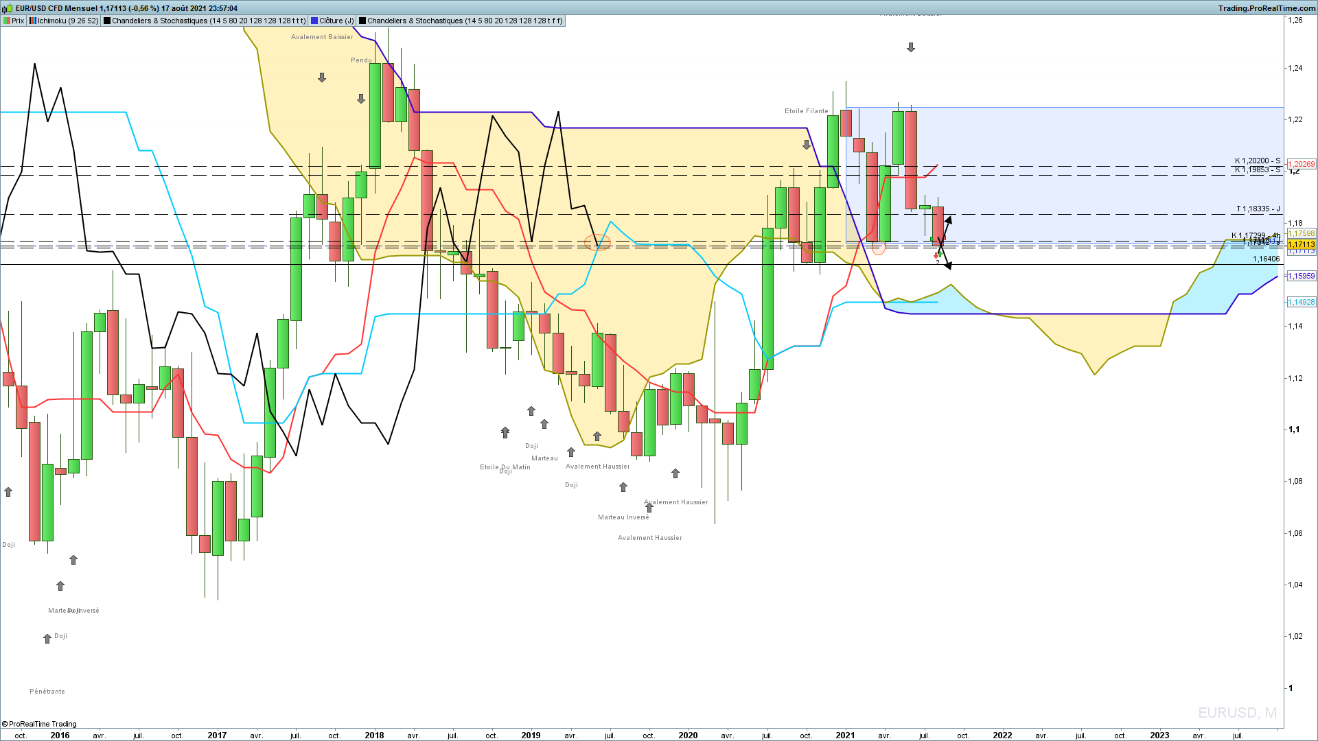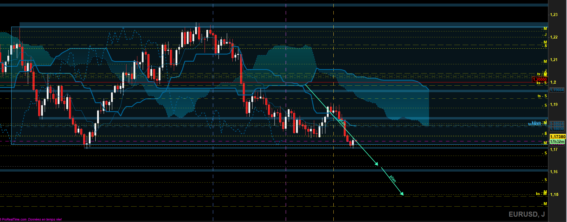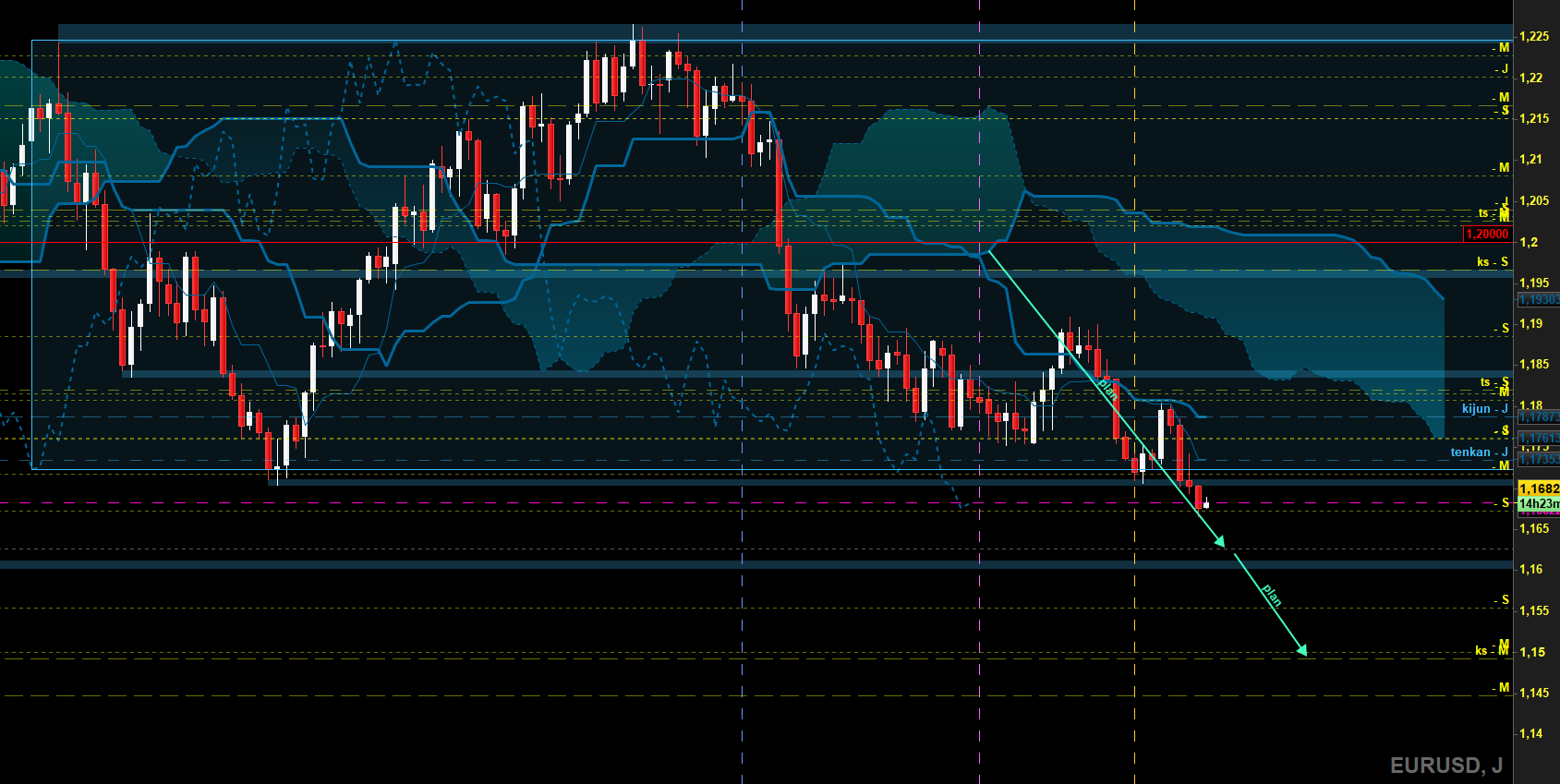 En effet le plat kijun en Mensuel est travaillé, les 1.1700 sont juste en dessous attention. Pour ma part je n'ai pas tracé le range hebdo malgré le Twist du nuage, ce point médian représente les 1.20000, j'attends de voir ce que fera le marché.