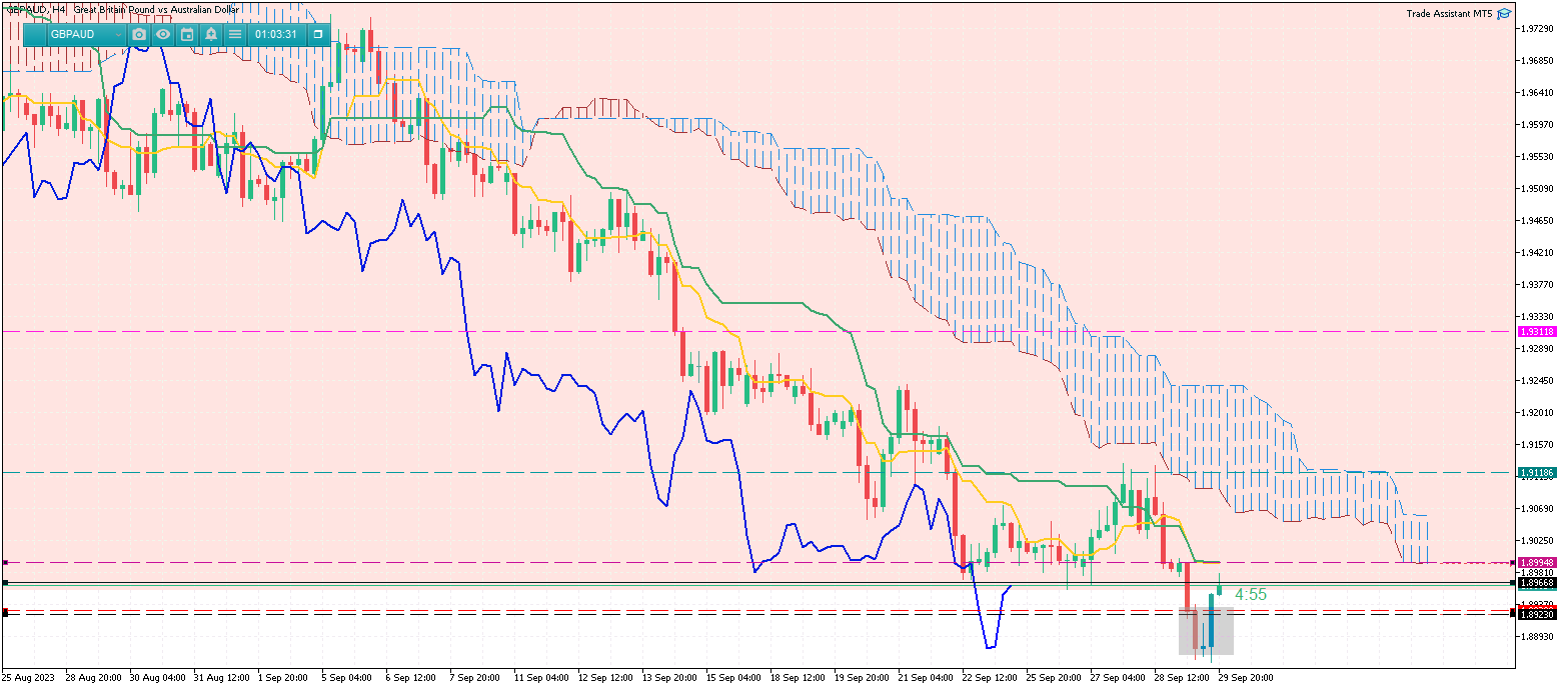 H4 : Prix en direction de la BHR après le rebond sur la BBR. A noter la bougie couverture en nuage noir au contact de la droite de tendance H4