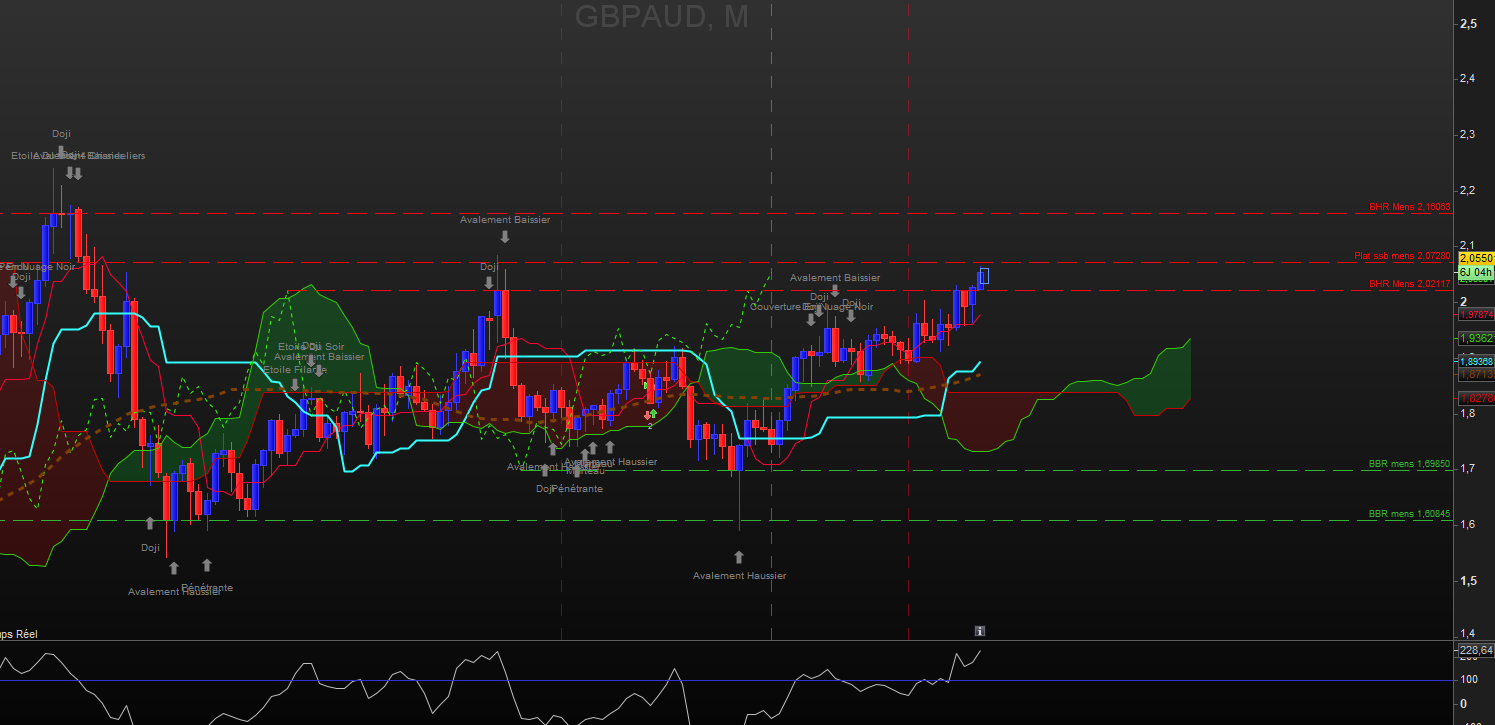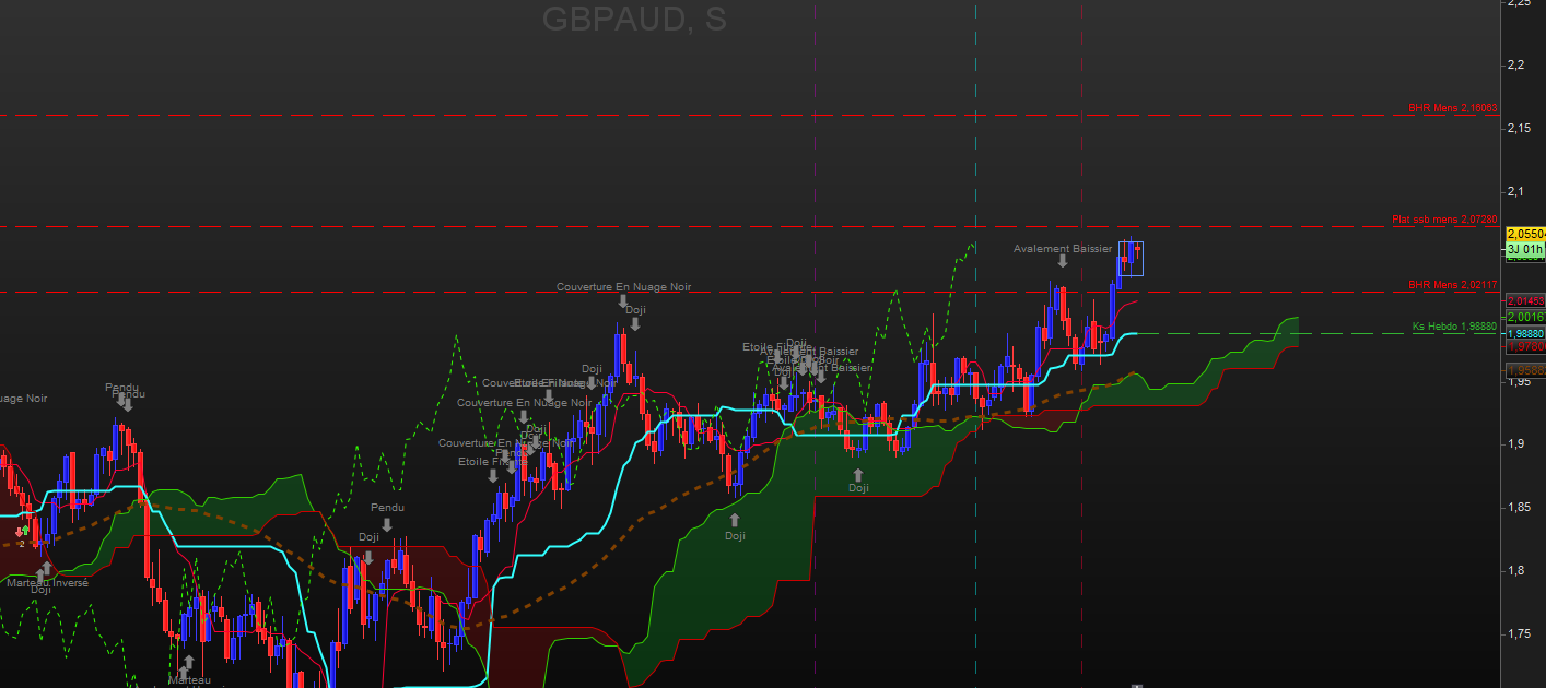 Hebdo : Tendance haussiere. Les prix se sont repliés sur Ks. Chikou arrive sur les prix. A noter que les prix sont passés en dessous d'anciens plats SSB