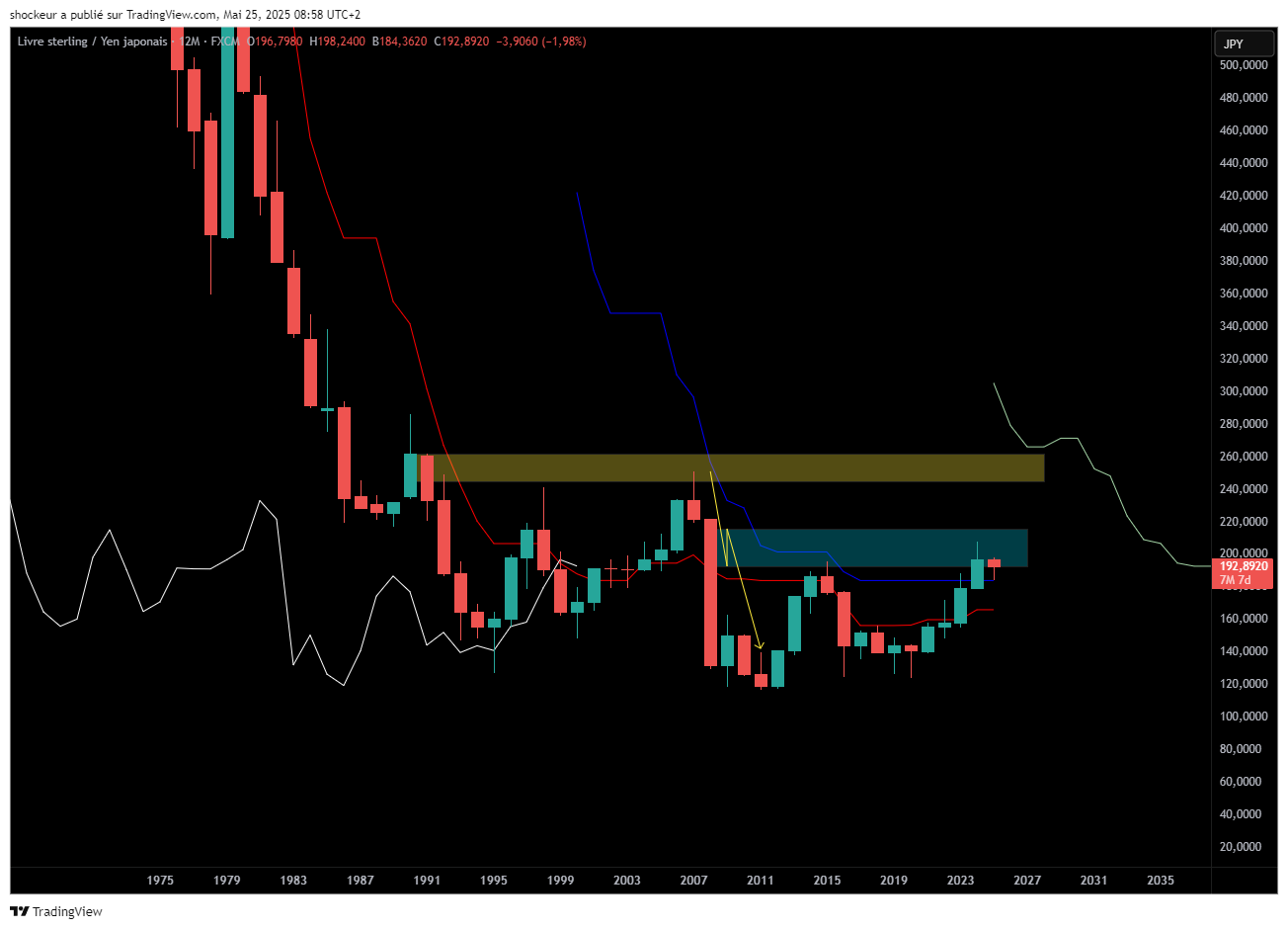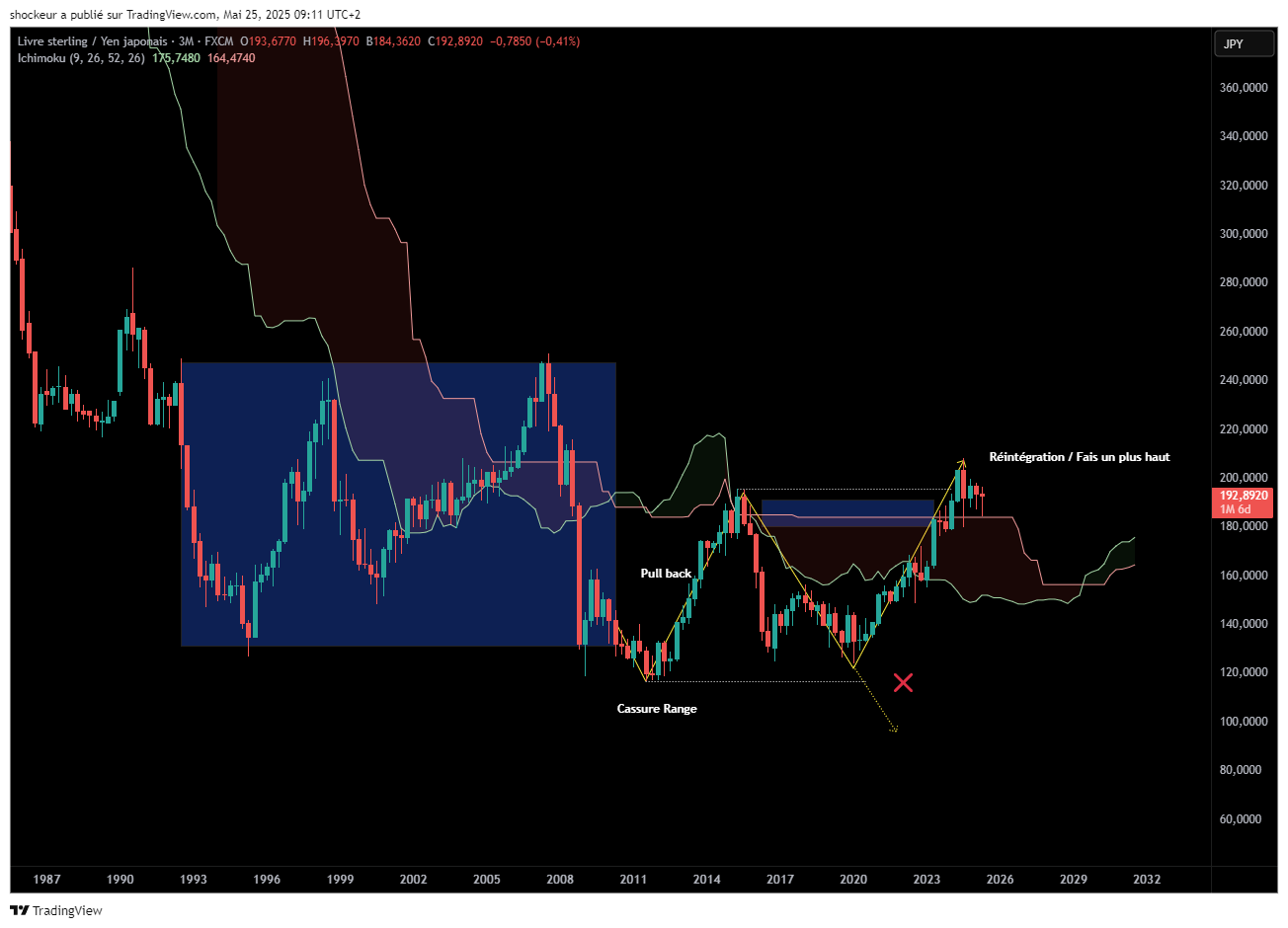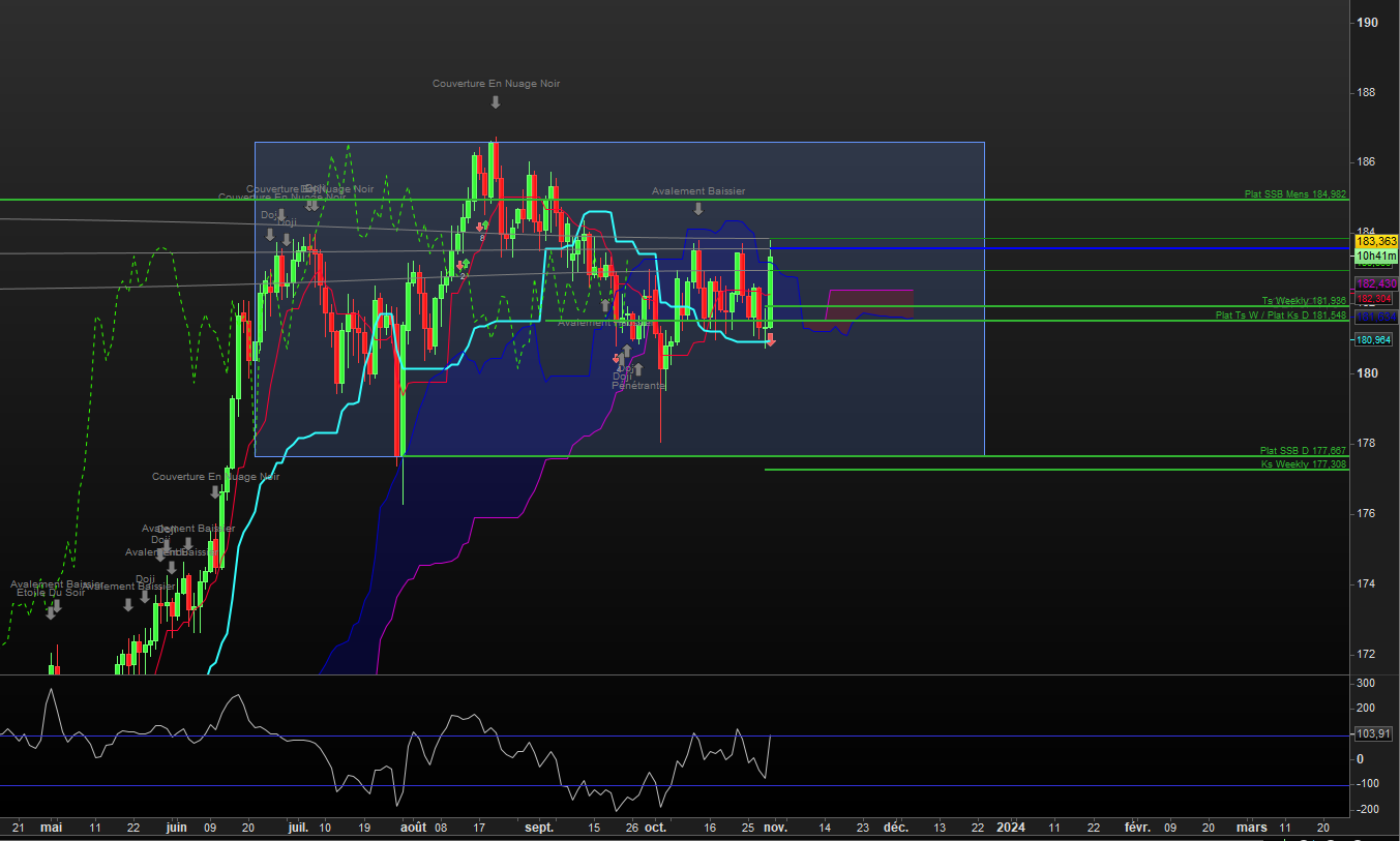 Mensuel: On se dirige sur le haut du range. Long plat SSB en résistance à 184,98. Obj haut de range : 193,6
