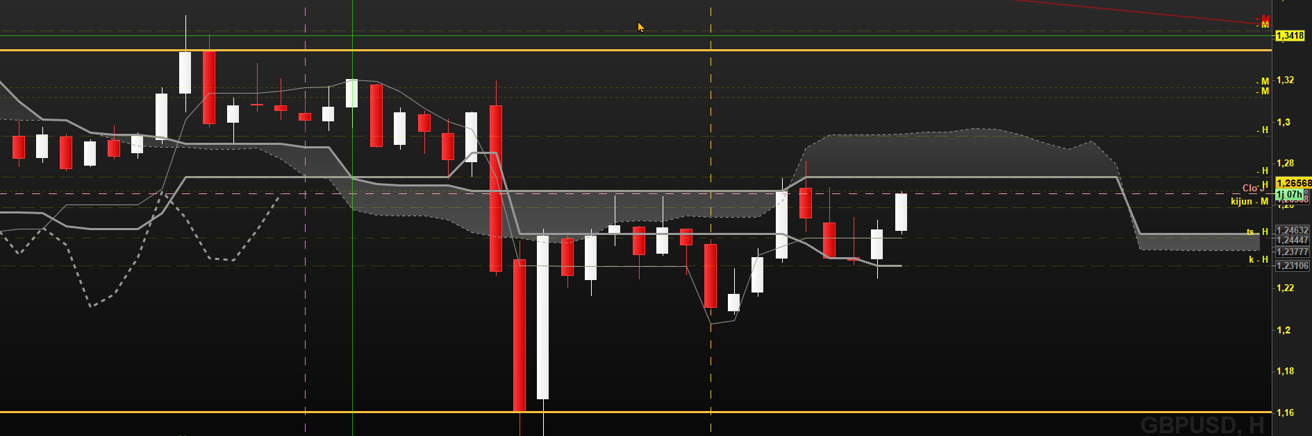 J'ai encore beaucoup de mal a interpréter les cassures surtout quand celles-ci partent très fortement (Validation et timing compliqués). De plus je doute toujours concernant les lignes (Tenkan ou Kijun) à prioriser après cassure.