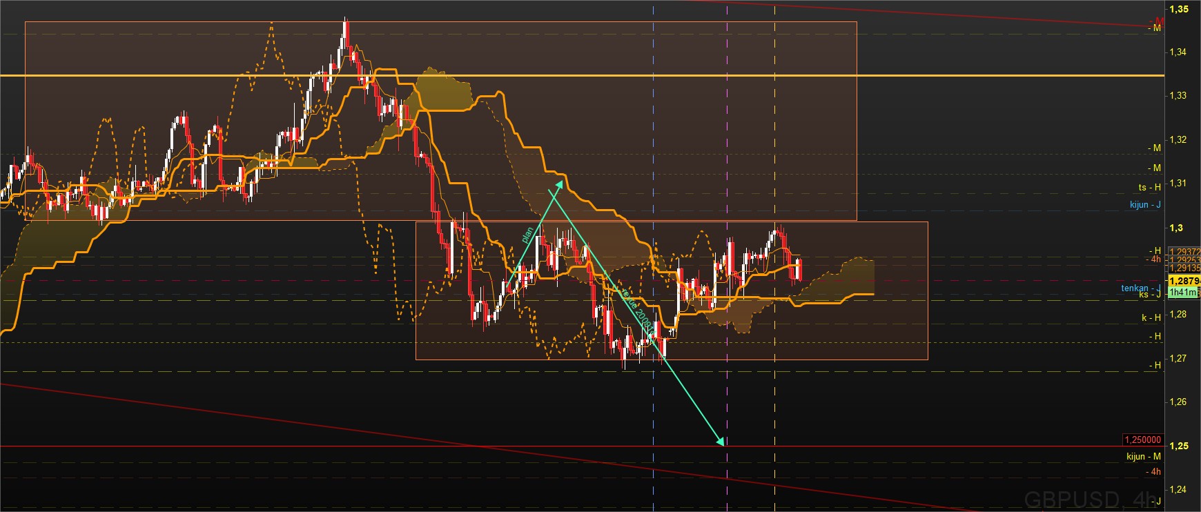En effet, je pense (je pense !) que le haut du range H4 est plus haut, ceci étant du à la Tenkan Hebdo qui est venu stopper (donc masquer le "vrai" haut du range H4) net la montée des cours.