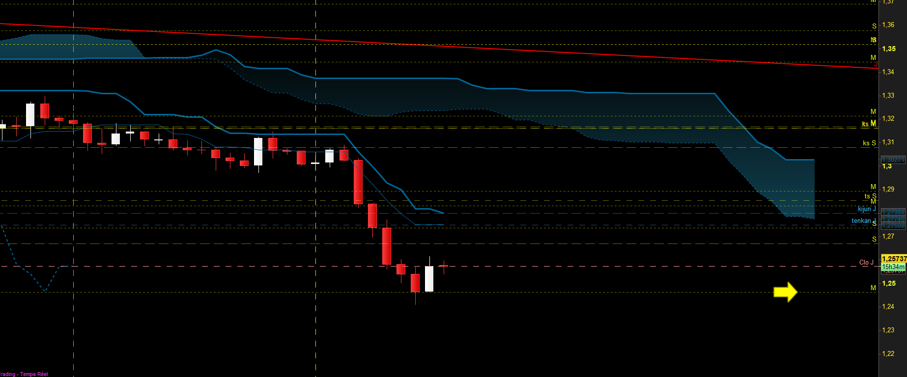 la journée d'hier ne nous aura fourni aucune info (normal, le marché britannique était fermé): ni validation de reverse, ni invalidation. Je crois toujours dans ce up et en H4, la kijun a cédé, ce qui montre un 1er signe de faiblesse dans la tendance baissière (mais attention, chikou devra casser ses résistances). la cassure de la tenkan sera aussi à surveiller pour une entrée plus sure