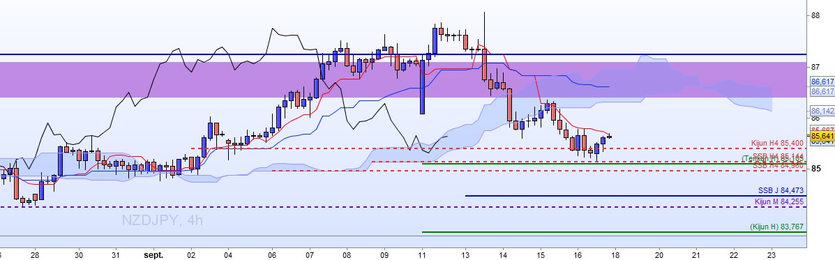 En range, mais qui ne fait plus que des rotations partielles depuis longtemps, et vient de casser. Certes de peu, certes en réintégrant ensuite, mais c'est cassé quand même. En revanche là on arrive dans une région compliquée, puisque les prix sont coincés entre la Kijun en haut, le Kumo en bas, et plein de supports à la Chikou. Globalement les supports sont quand même plus solides que les résistances, mais ça n'en est pas moins une région compliquée.
